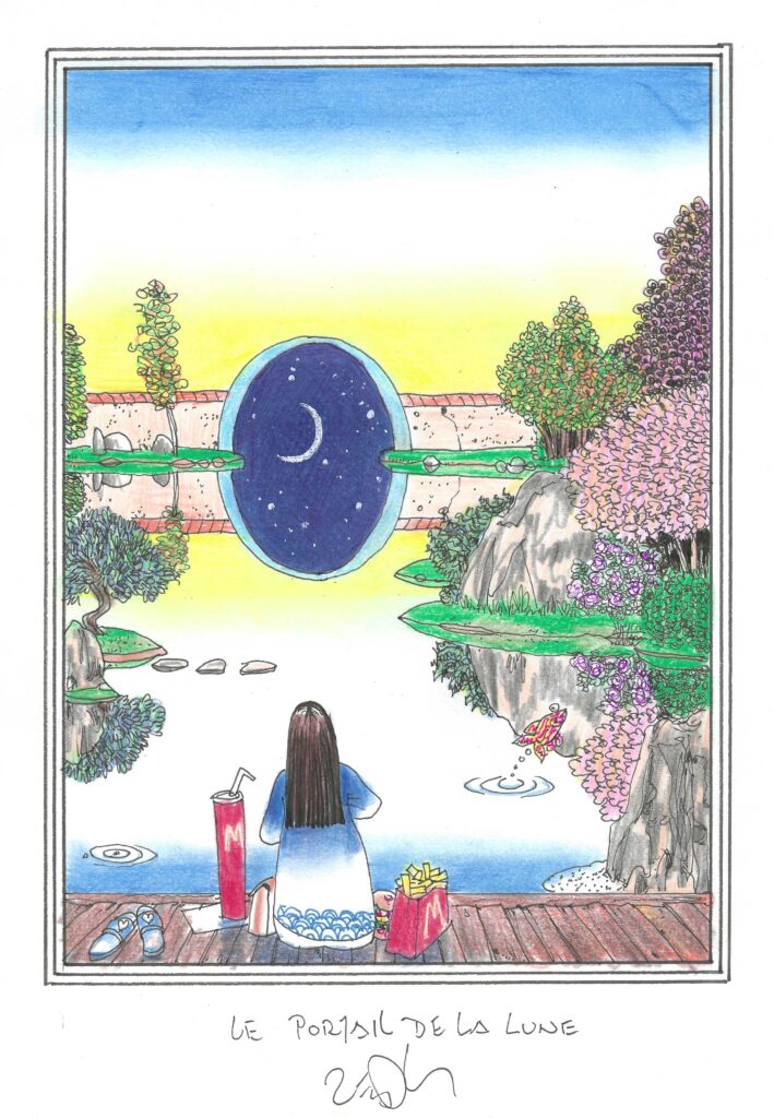 Drawing of the Day – 3712 – Dessin du Jour « The moongate – Le portail de la lune » Ink & colour on Paper – 8 x 12″ (21 x 30 cm) – Encre & couleurs sur Papier