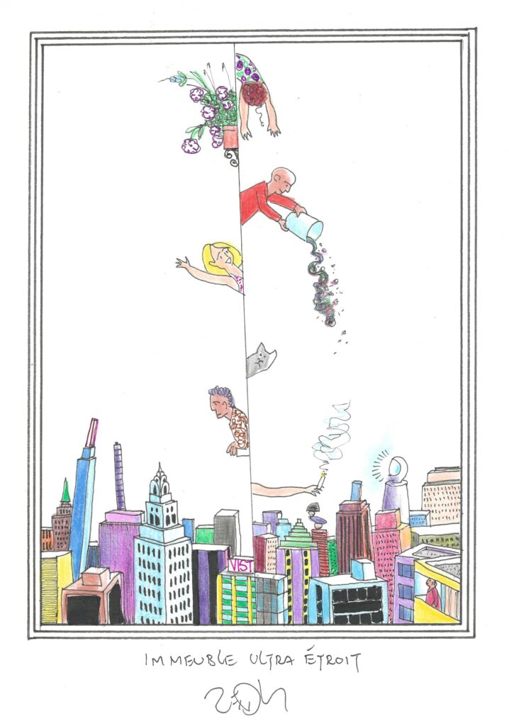 Drawing of the Day – 3714 – Dessin du Jour « Ultra slim apartment building – Immeuble ultra étroit » Ink & colour on Paper – 8 x 12″ (21 x 30 cm) – Encre & couleurs sur Papier