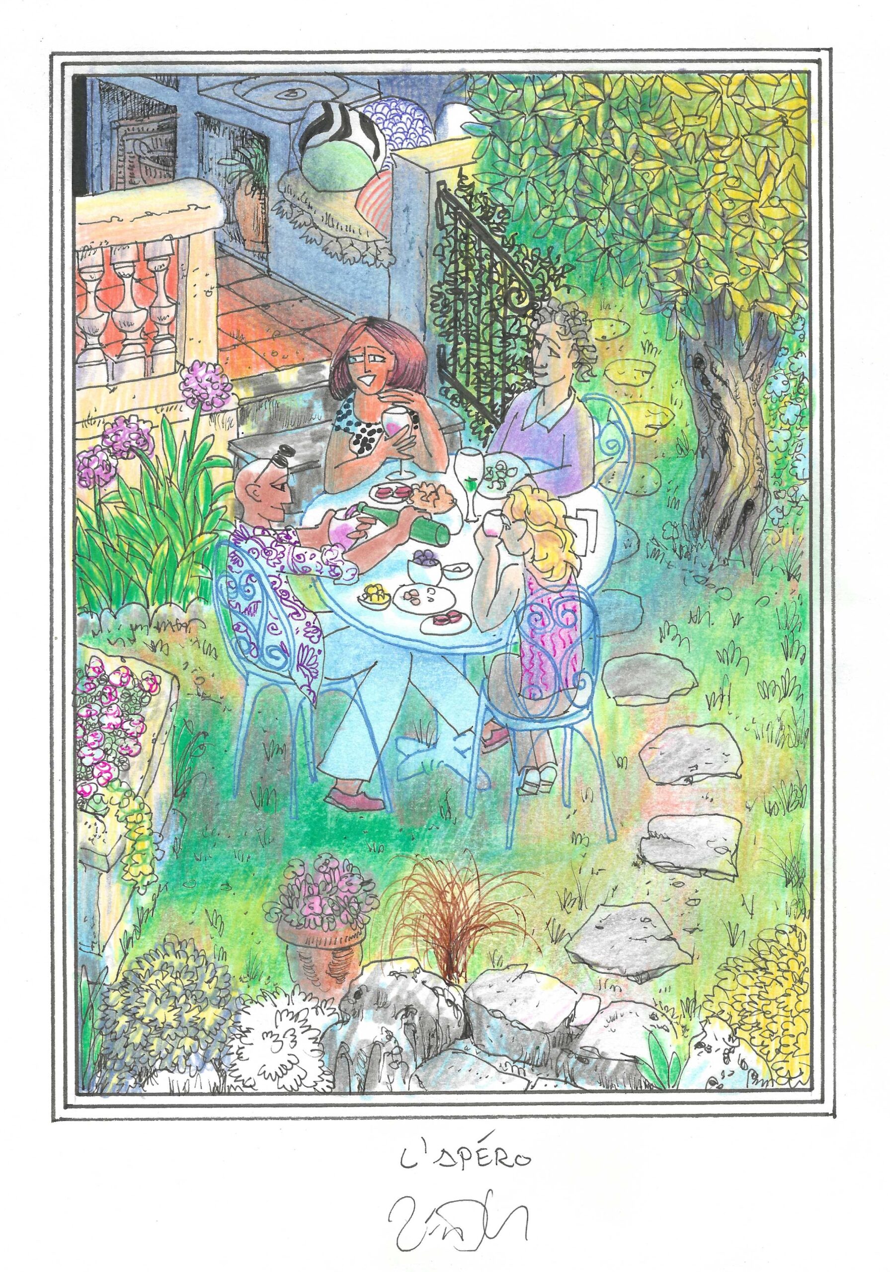 Drawing of the Day – 3715 – Dessin du Jour « L’Apéro » Ink & colour on Paper – 8 x 12″ (21 x 30 cm) – Encre & couleurs sur Papier