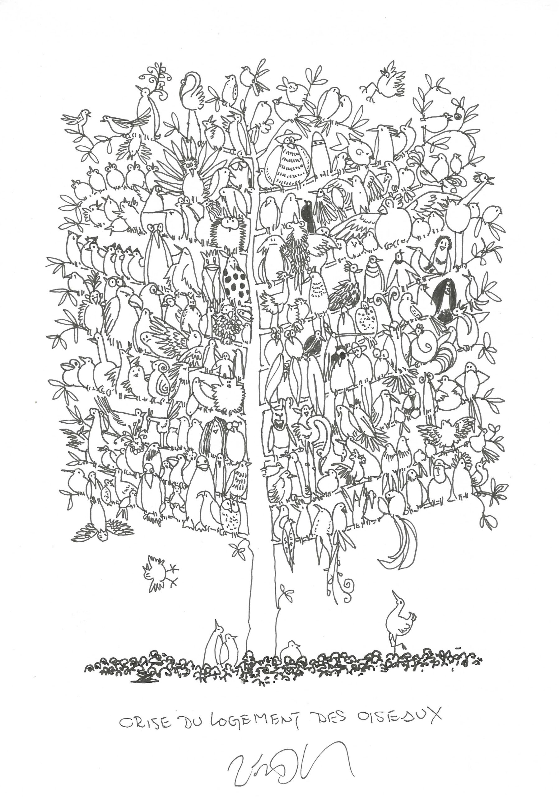 Drawing of the Day – 3716 – Dessin du Jour « Bird housing crisis – Crise du logement des oiseaux » Ink on Paper – 8 x 12″ (21 x 30 cm) – Encre sur Papier