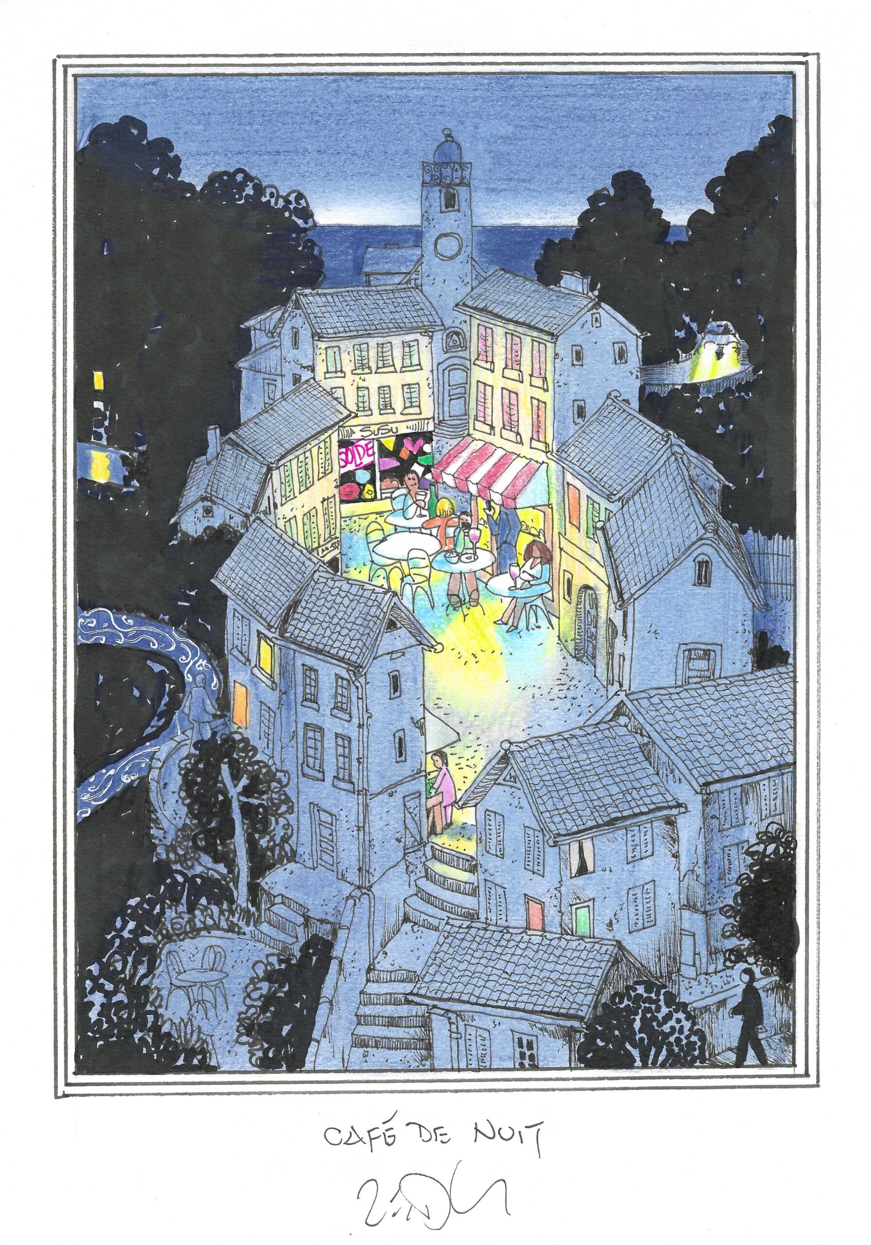 Drawing of the Day – 3717 – Dessin du Jour « Night café – Café de nuit » Ink & colour on Paper – 8 x 12″ (21 x 30 cm) – Encre & couleurs sur Papier