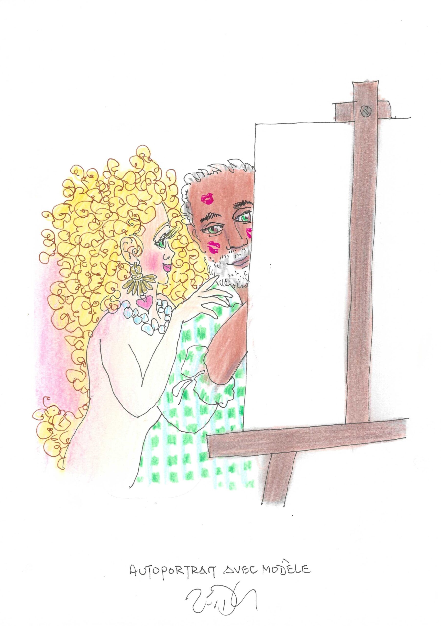 Drawing of the Day – 3718 – Dessin du Jour « Self portrait with model – Autoportrait avec modèle » Ink & colour on Paper – 8 x 12″ (21 x 30 cm) – Encre & couleurs sur Papier