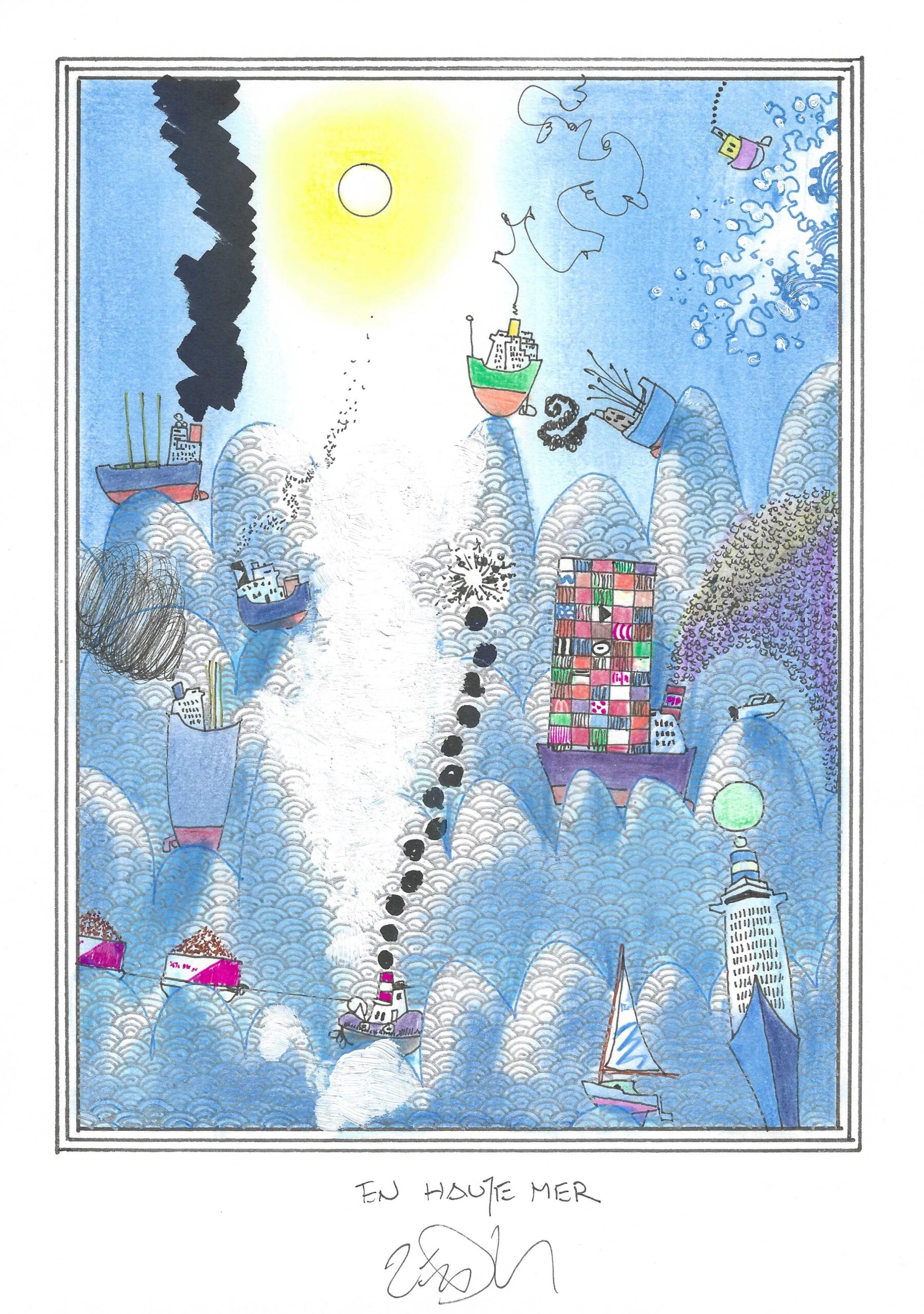 Drawing of the Day – 3719 – Dessin du Jour « On the high seas – En haute mer » Ink & colour on Paper – 8 x 12″ (21 x 30 cm) – Encre & couleurs sur Papier