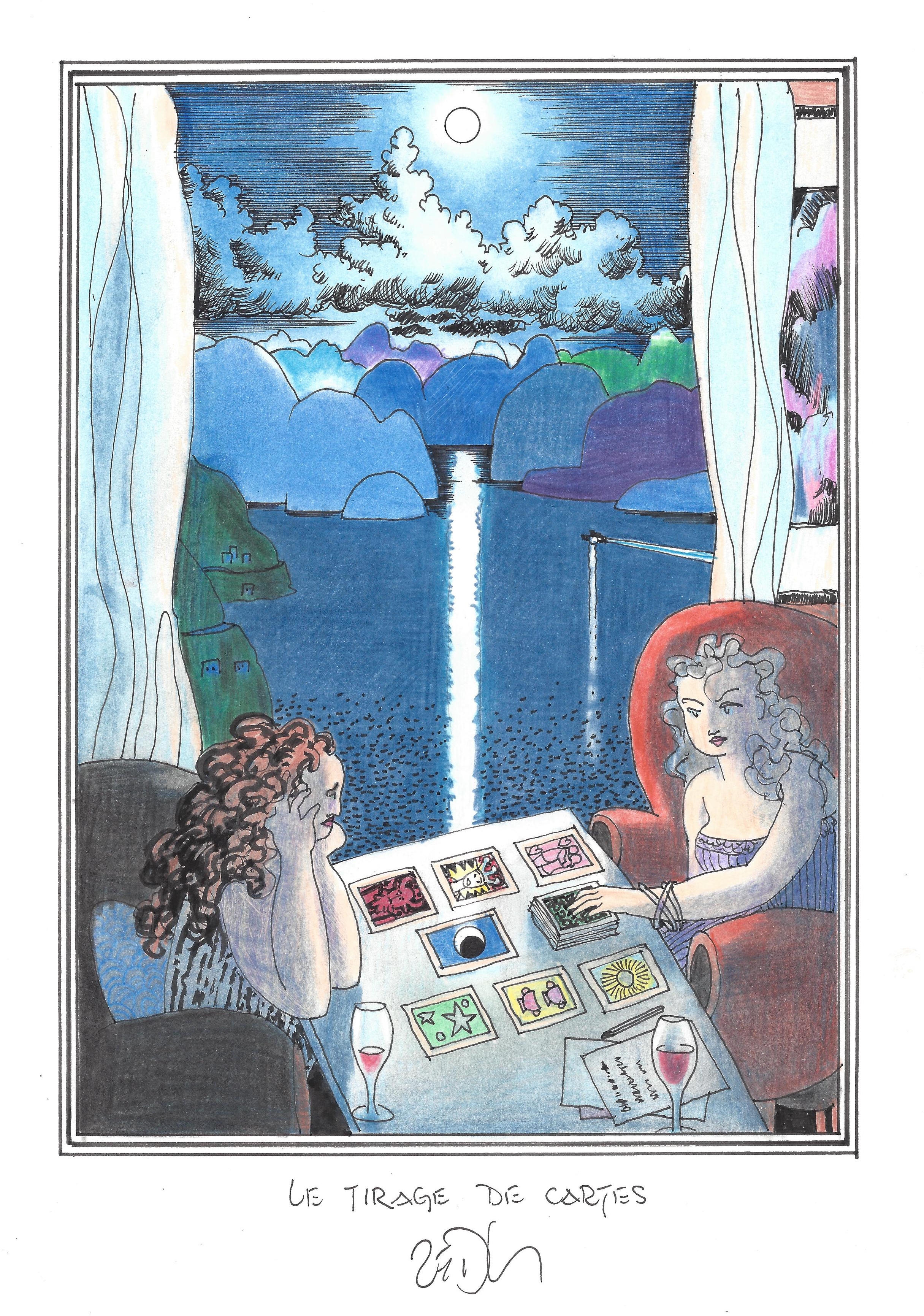 Drawing of the Day – 2733 – Dessin du jour « The reading – Le tirage de cartes » Ink & colour on Paper – 8 x 12″ (21 x 30 cm) – Encre & couleurs sur Papier