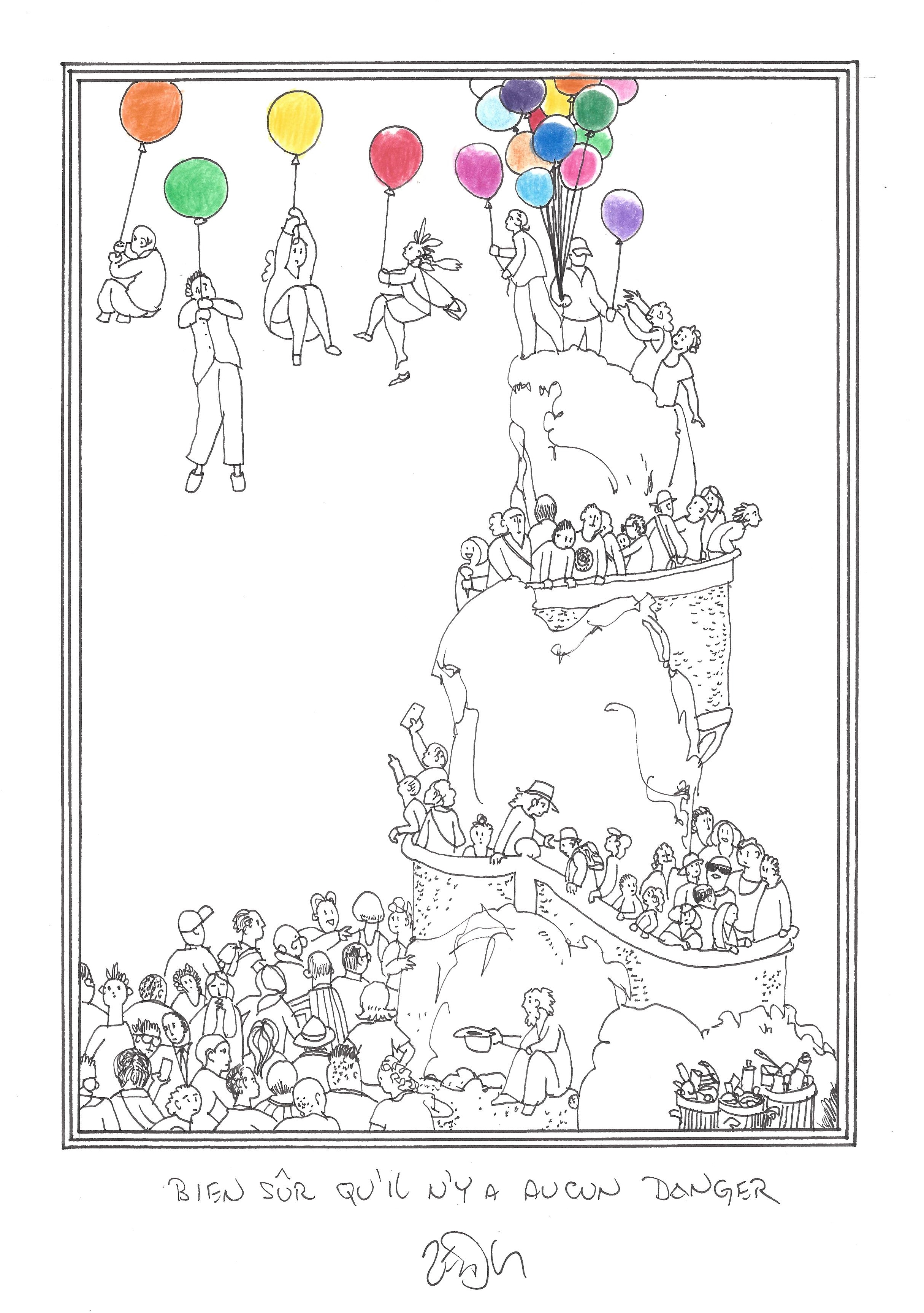Drawing of the Day – 2735 – Dessin du jour « Of course it’s safe – Bien sûr qu’il n’y a aucun danger » Ink & colour on Paper – 8 x 12″ (21 x 30 cm) – Encre & couleurs sur Papier