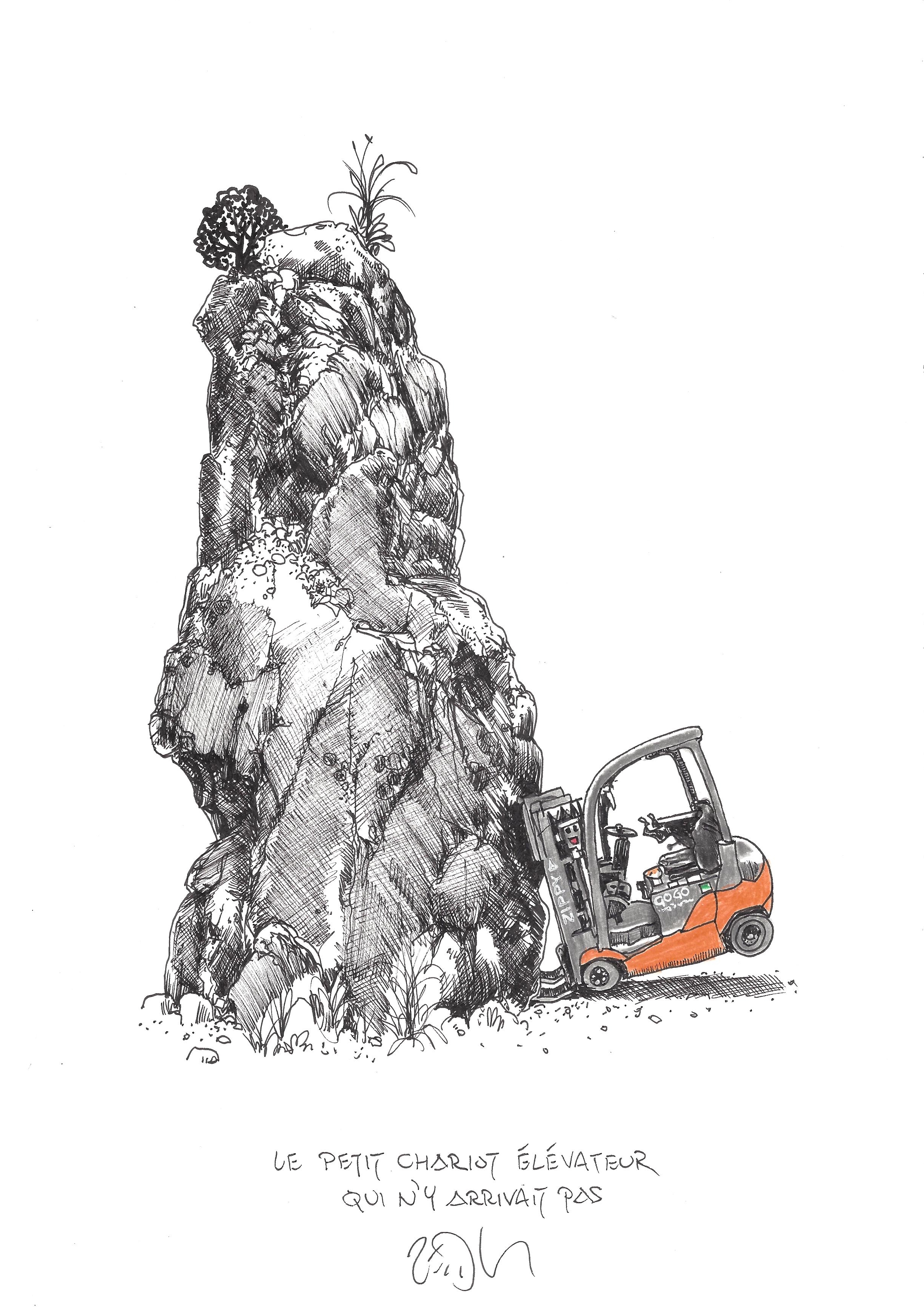 Drawing of the Day – 2679 – Dessin du jour « The little forklift that couldn’t – Le petit chariot élévateur qui n’y arrivait pas » Ink & colour on Paper – 8 x 12″ (21 x 30 cm) – Encre & couleurs sur Papier