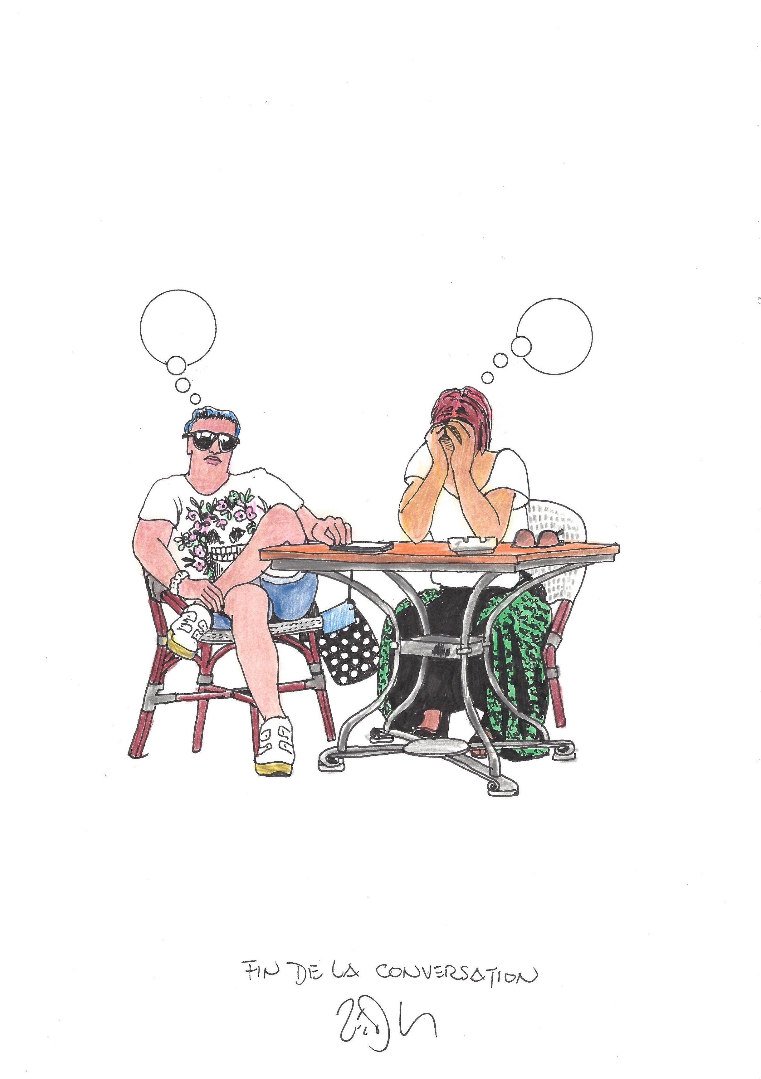 Drawing of the Day – 2681 – Dessin du jour « End of conversation – Fin de la conversation » Ink & colour on Paper – 8 x 12″ (21 x 30 cm) – Encre & couleurs sur Papier