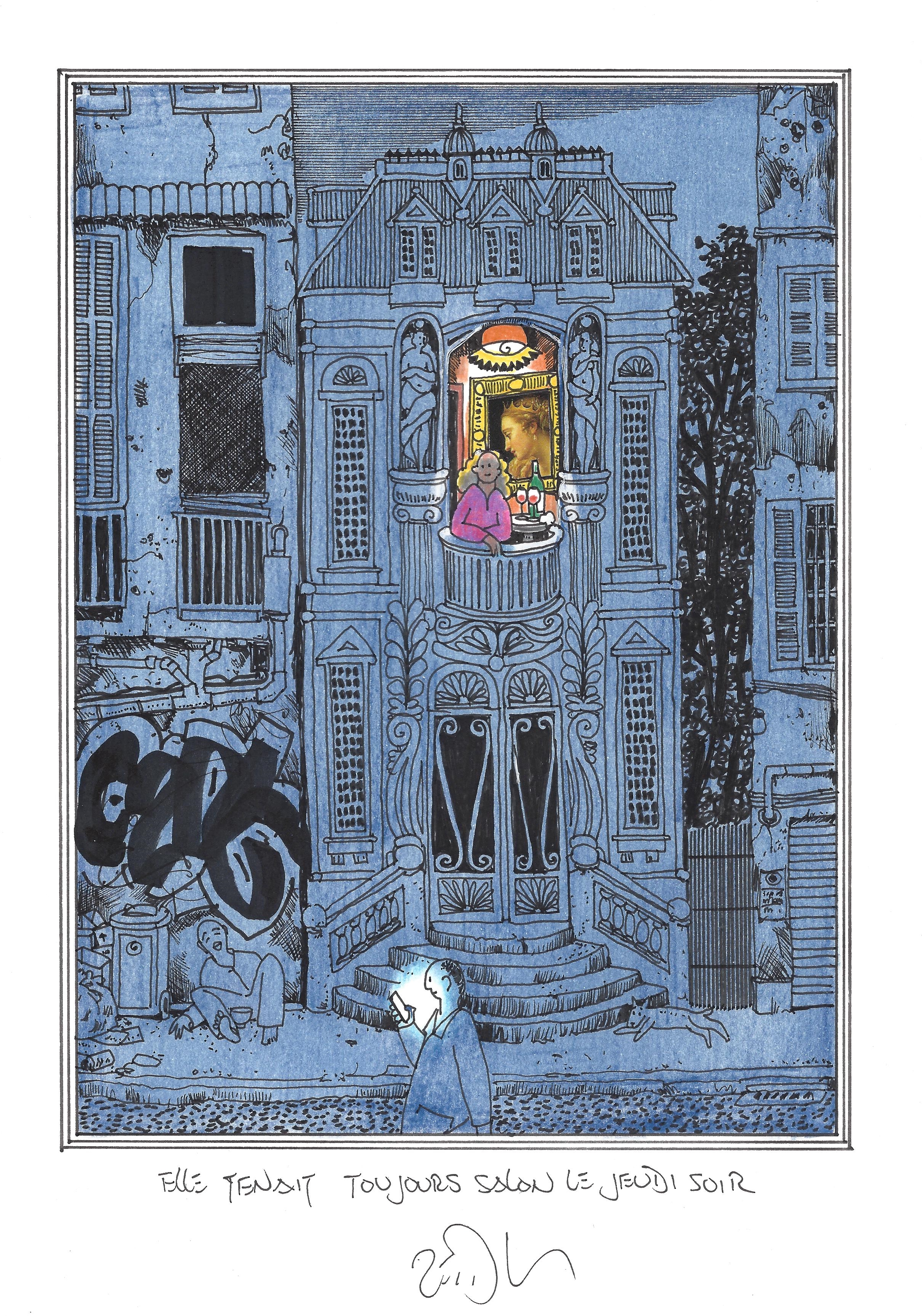 Drawing of the Day – 2682 – Dessin du jour « She always held her Thursday night salon – Elle tenait toujours salon le jeudi soir » Mixed Media on Paper – 8 x 12″ (21 x 30 cm) – Technique mixte sur Papier