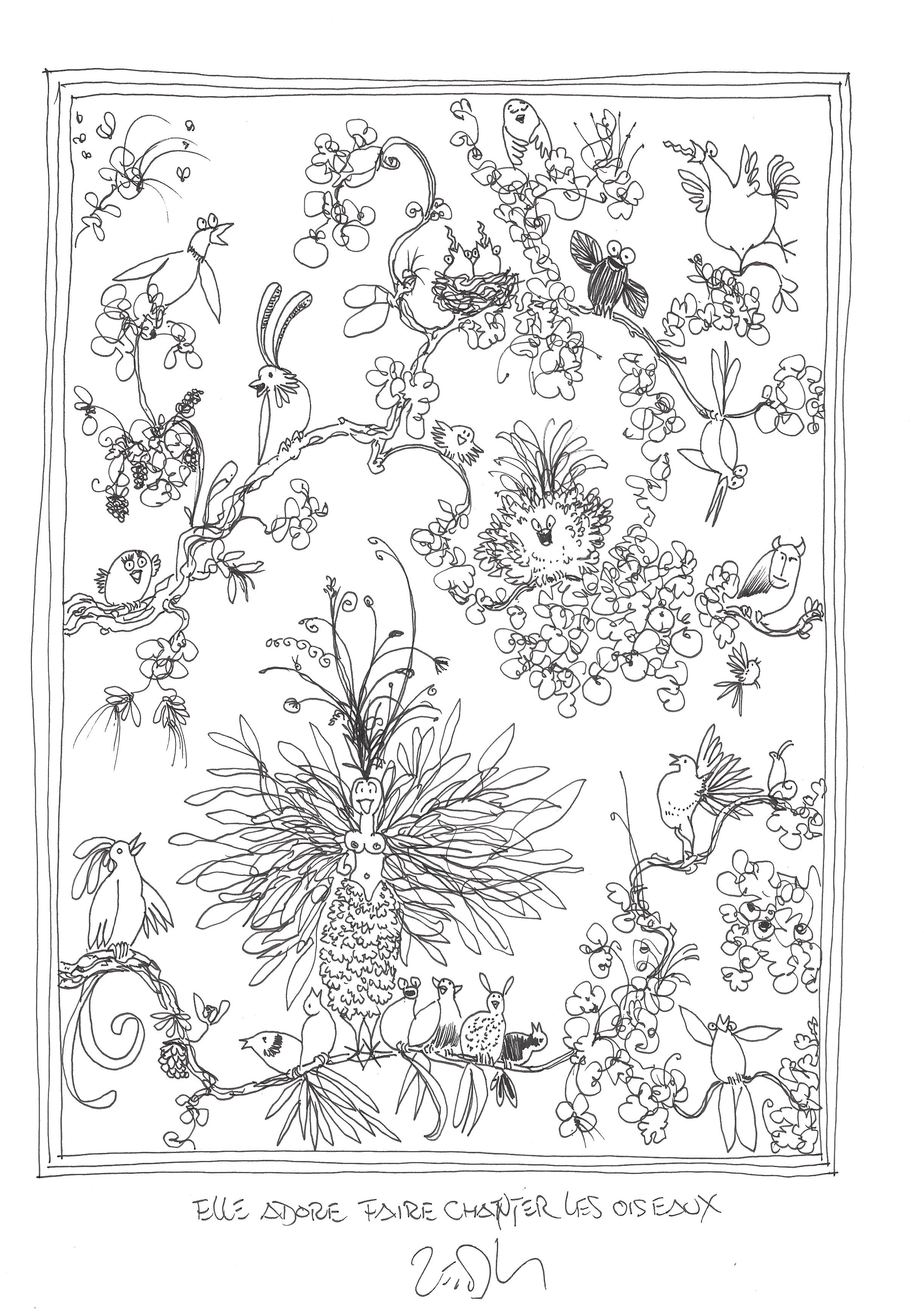 Drawing of the Day – 2683 – Dessin du jour « She just loves getting all the birds to sing – Elle adore faire chanter les oiseaux » Ink on Paper – 8 x 12″ (21 x 30 cm) – Encre sur Papier