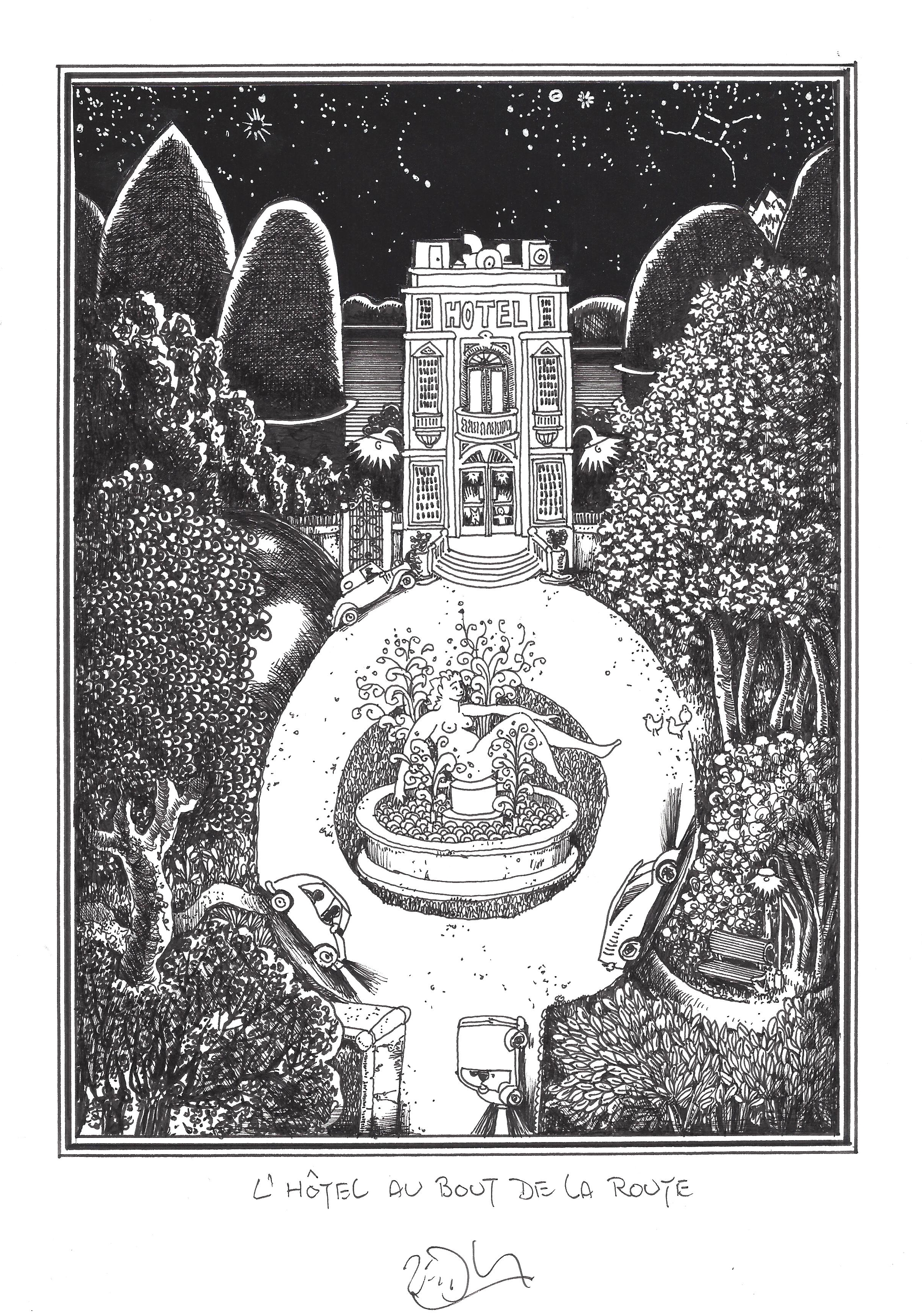 Drawing of the Day – 2685 – Dessin du jour « Hotel at the end of the road – L’hôtel au bout de la route » Mixed Media on Paper – 8 x 12″ (21 x 30 cm) – Technique mixte sur Papier