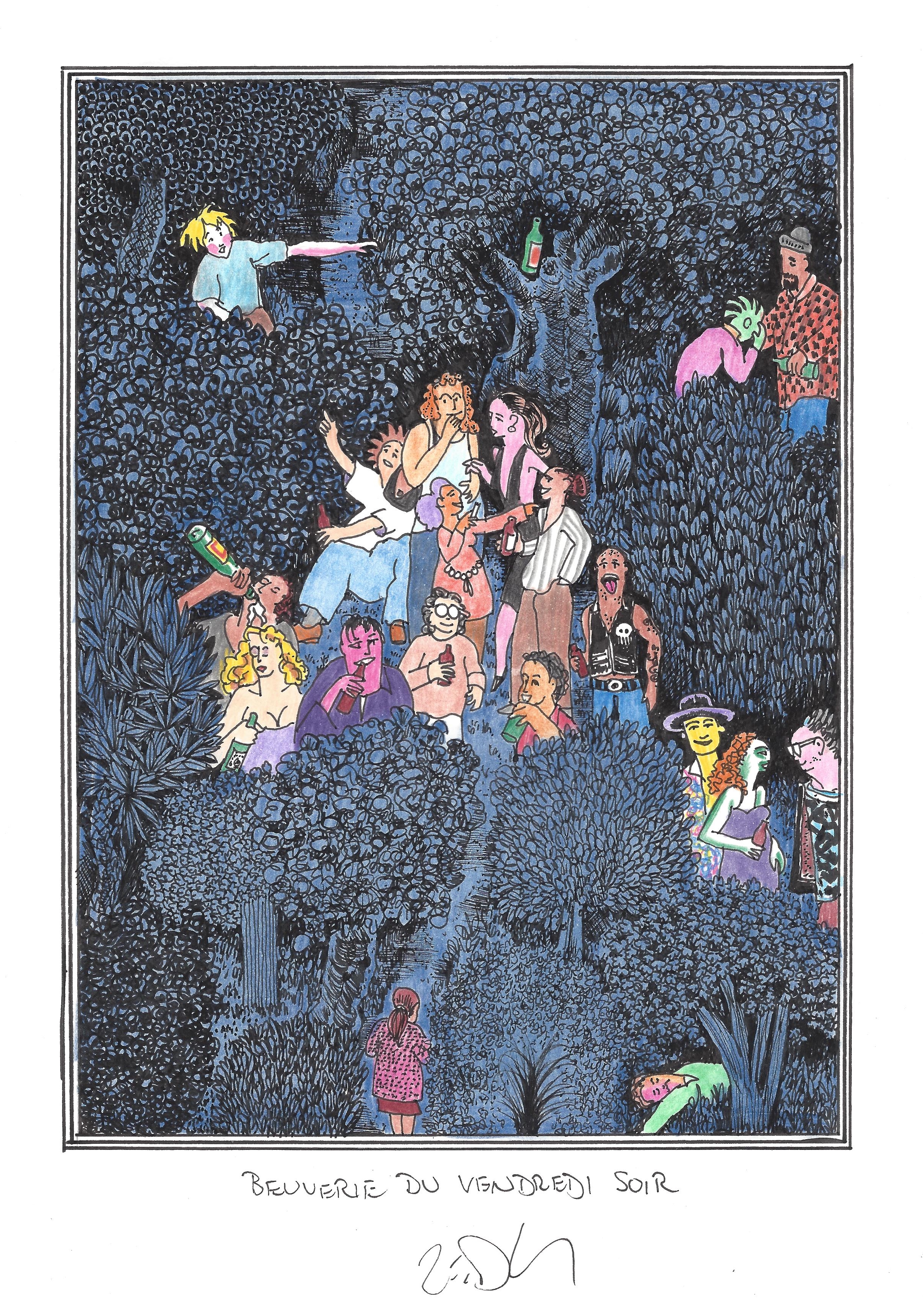Drawing of the Day – 2687 – Dessin du jour « Friday night booze-up – Beuverie du vendredi soir » Ink & colour on Paper – 8 x 12″ (21 x 30 cm) – Encre & couleurs sur Papier