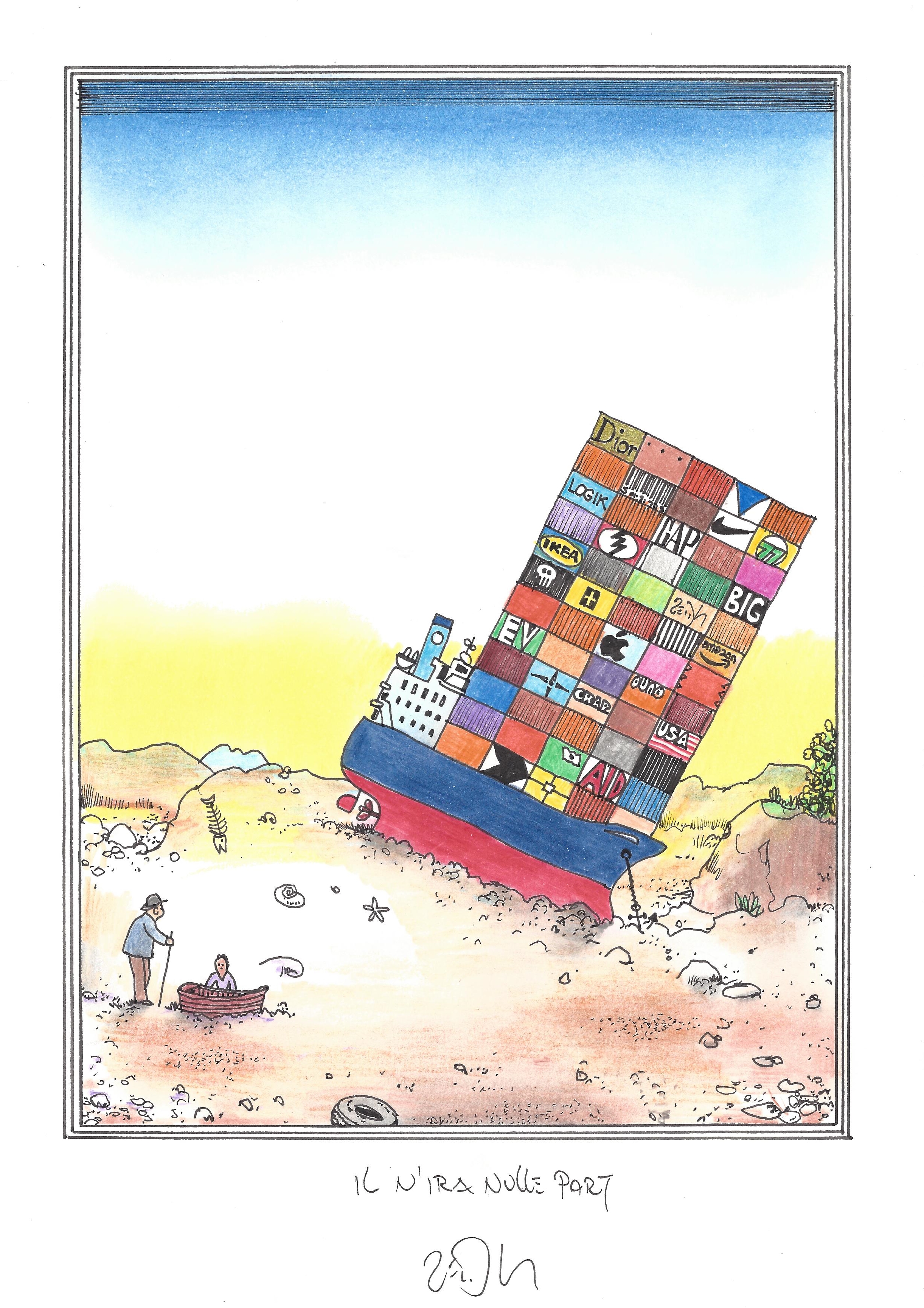 Drawing of the Day – 2688 – Dessin du jour « Not going anywhere – Il n’ira nulle part » Ink & colour on Paper – 8 x 12″ (21 x 30 cm) – Encre & couleurs sur Papier