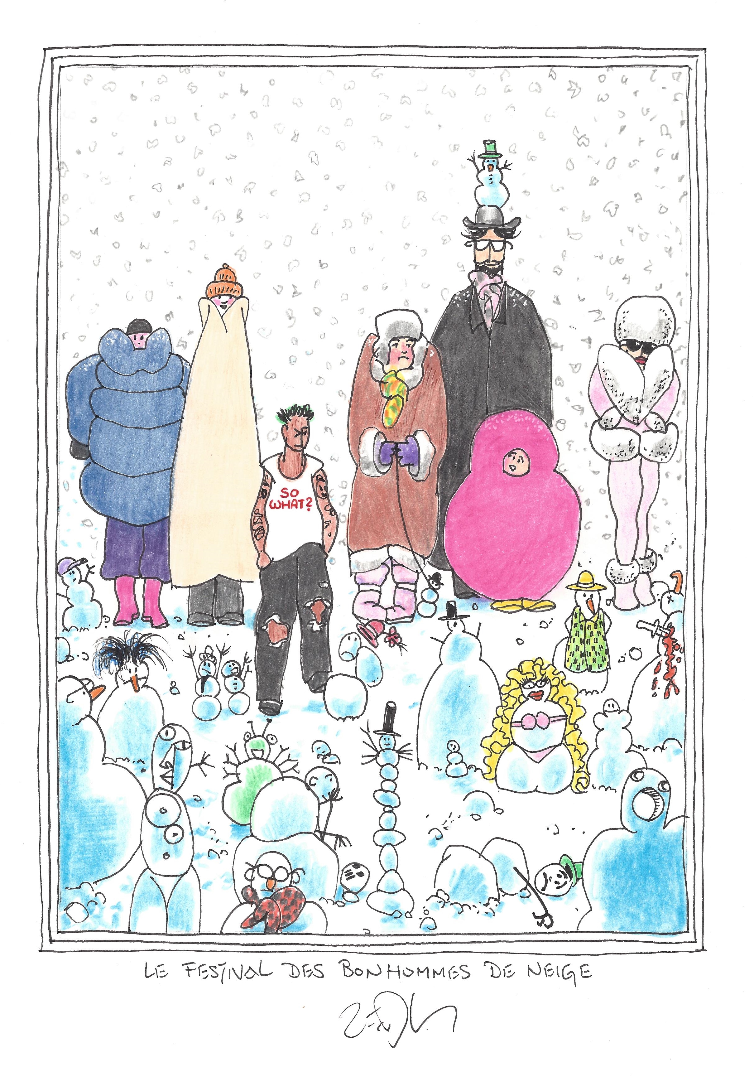 Drawing of the Day – 2659 – Dessin du jour « At the snowman festival – Le festival des bonhommes de neige » Ink & colour on Paper – 8 x 12″ (21 x 30 cm) – Encre & couleurs sur Papier