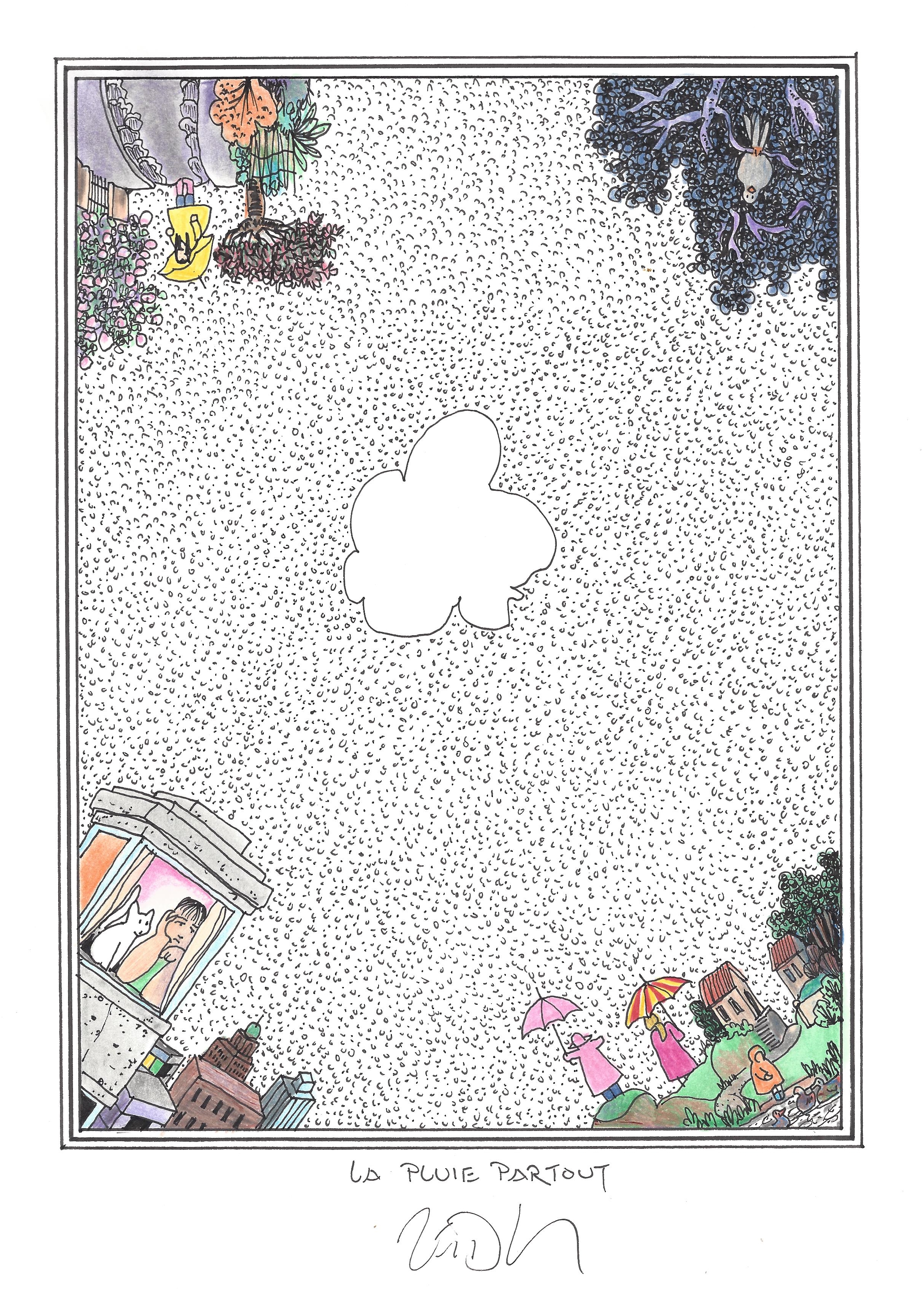 Drawing of the Day – 2661 – Dessin du jour « Rain everywhere – La pluie partout » Ink & colour on Paper – 8 x 12″ (21 x 30 cm) – Encre & couleurs sur Papier