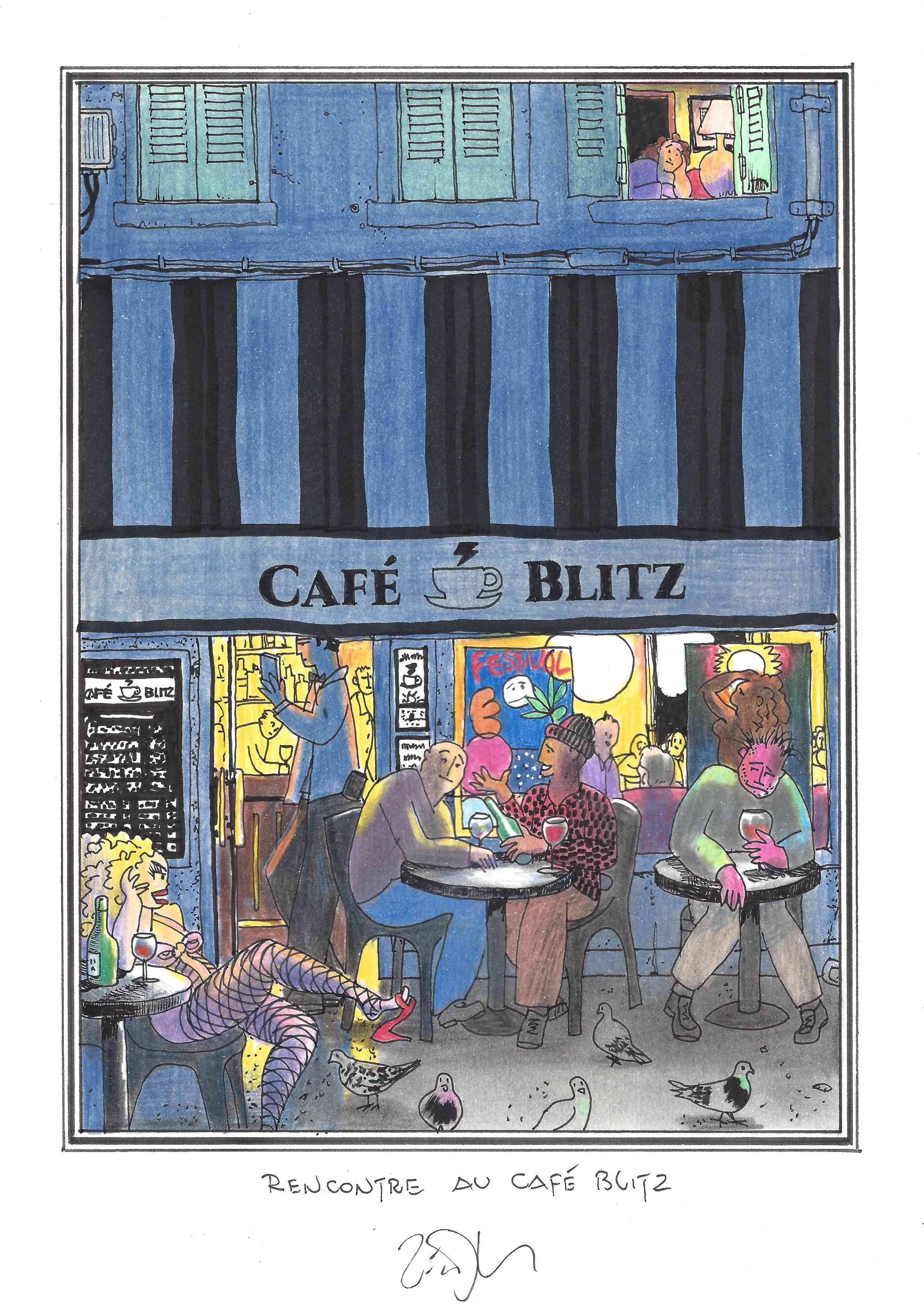 Drawing of the Day – 2662 – Dessin du jour « Encounter at Café Blitz – Rencontre au Café Blitz » Ink & colour on Paper – 8 x 12″ (21 x 30 cm) – Encre & couleurs sur Papier