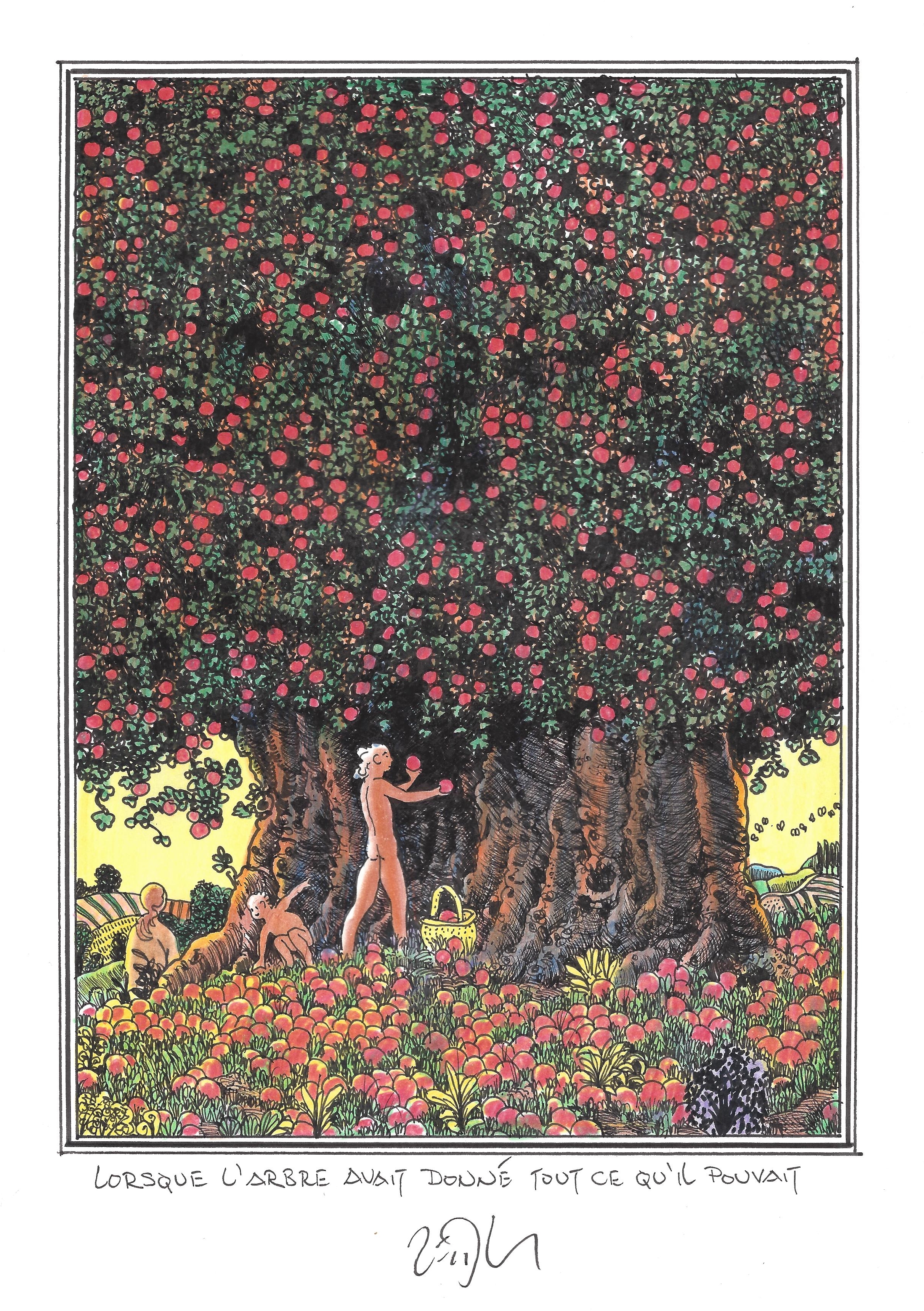 Drawing of the Day – 2665 – Dessin du jour « When the tree gave everything it could – Lorsque l’arbre avait donné tout ce qu’il pouvait » Ink & colour on Paper – 8 x 12″ (21 x 30 cm) – Encre & couleurs sur Papier