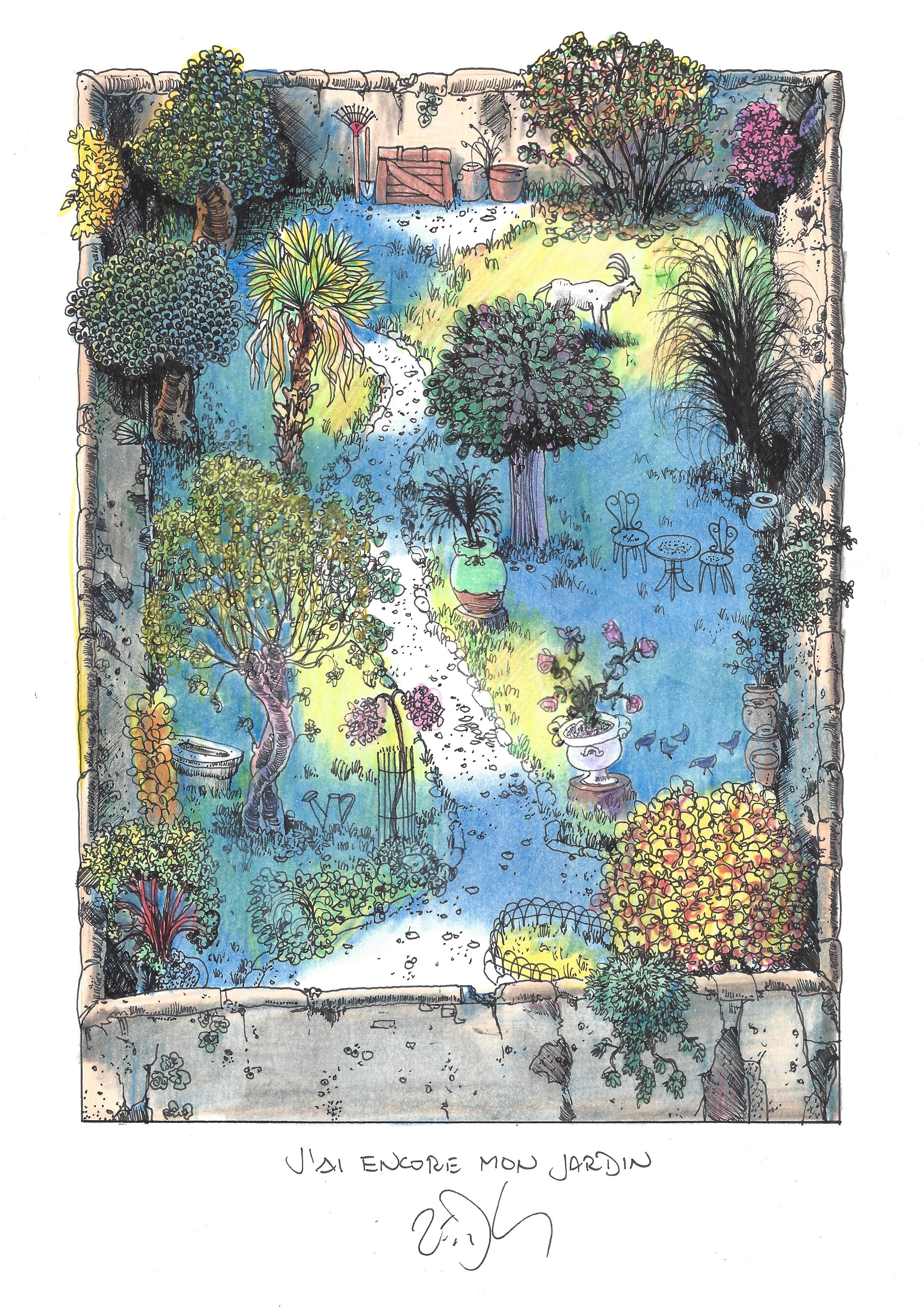 Drawing of the Day – 2667 – Dessin du jour « I still have my garden – J’ai encore mon jardin » Ink & colour on Paper – 8 x 12″ (21 x 30 cm) – Encre & couleurs sur Papier