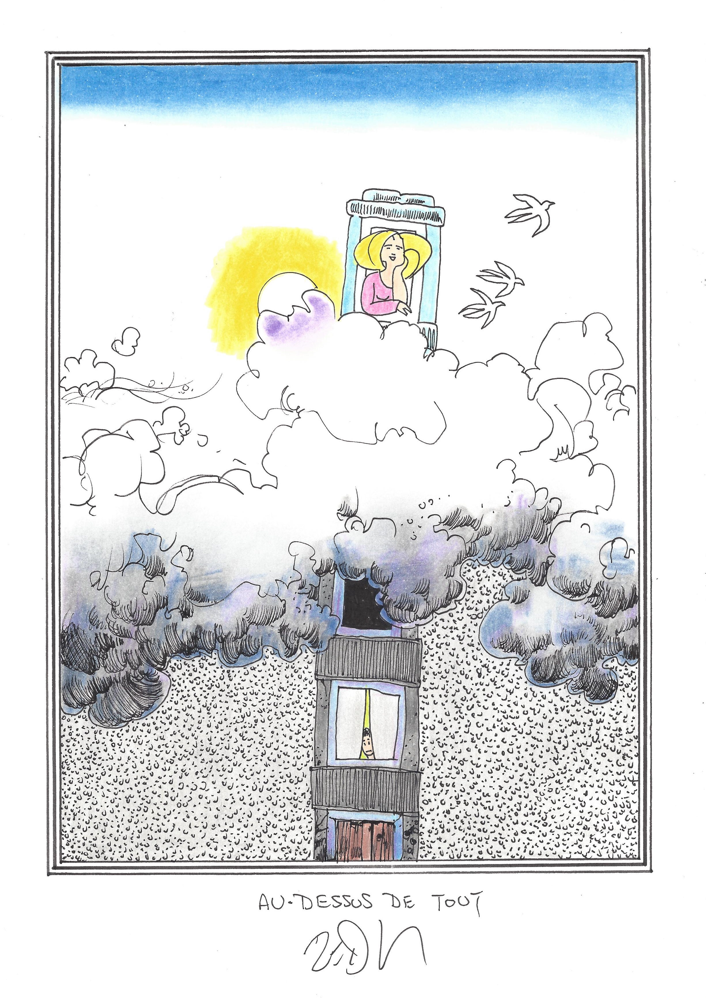 Drawing of the Day – 2668 – Dessin du jour « Above it all – Au-dessus de tout » Ink & colour on Paper – 8 x 12″ (21 x 30 cm) – Encre & couleurs sur Papier