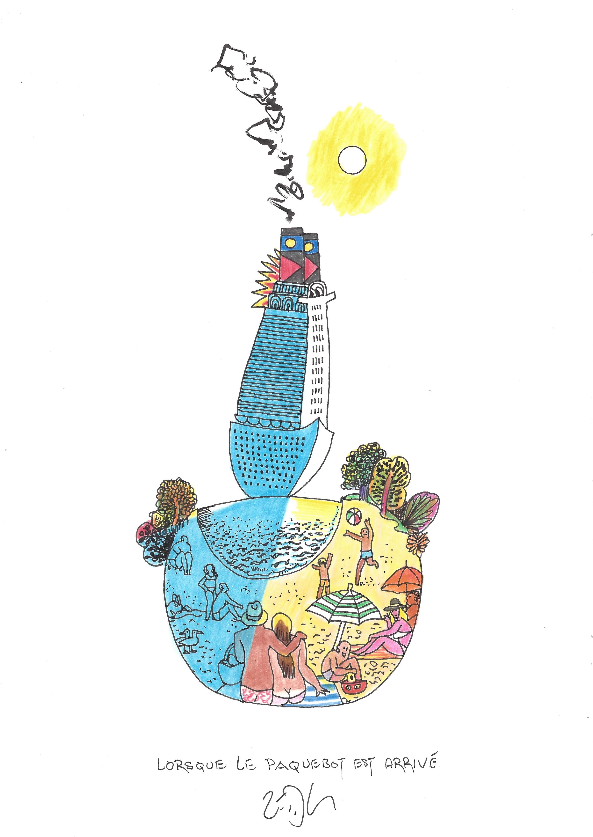 Drawing of the Day – 2639 – Dessin du jour « When the big boat came – Lorsque le paquebot est arrivé » Ink & color on Paper – 8 x 12″ (21 x 30 cm) – Encre & couleurs sur Papier