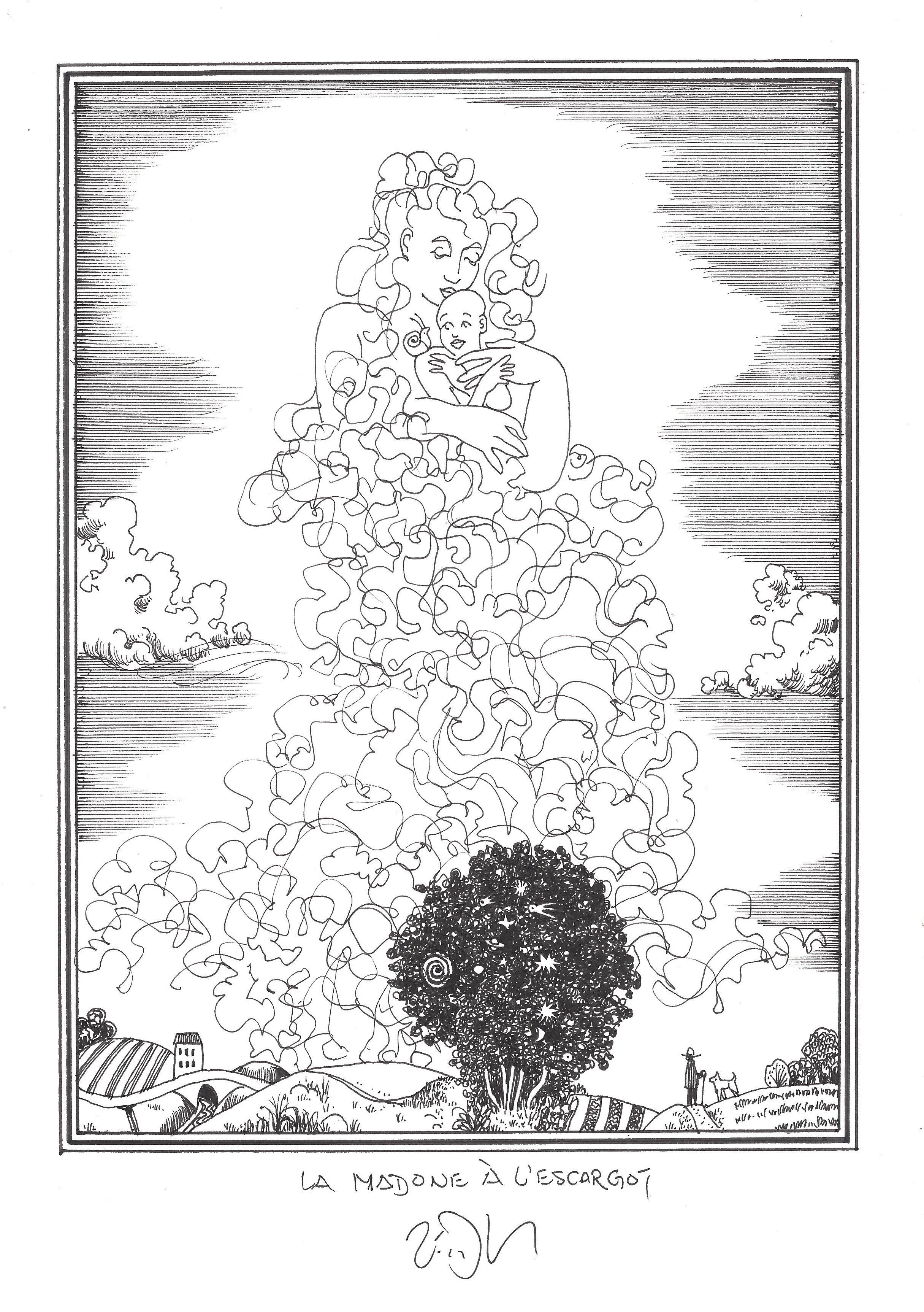 Drawing of the Day – 2640 – Dessin du jour « The madonna of the snail – La madone à l’escargot » Ink on Paper – 8 x 12″ (21 x 30 cm) – Encre sur Papier