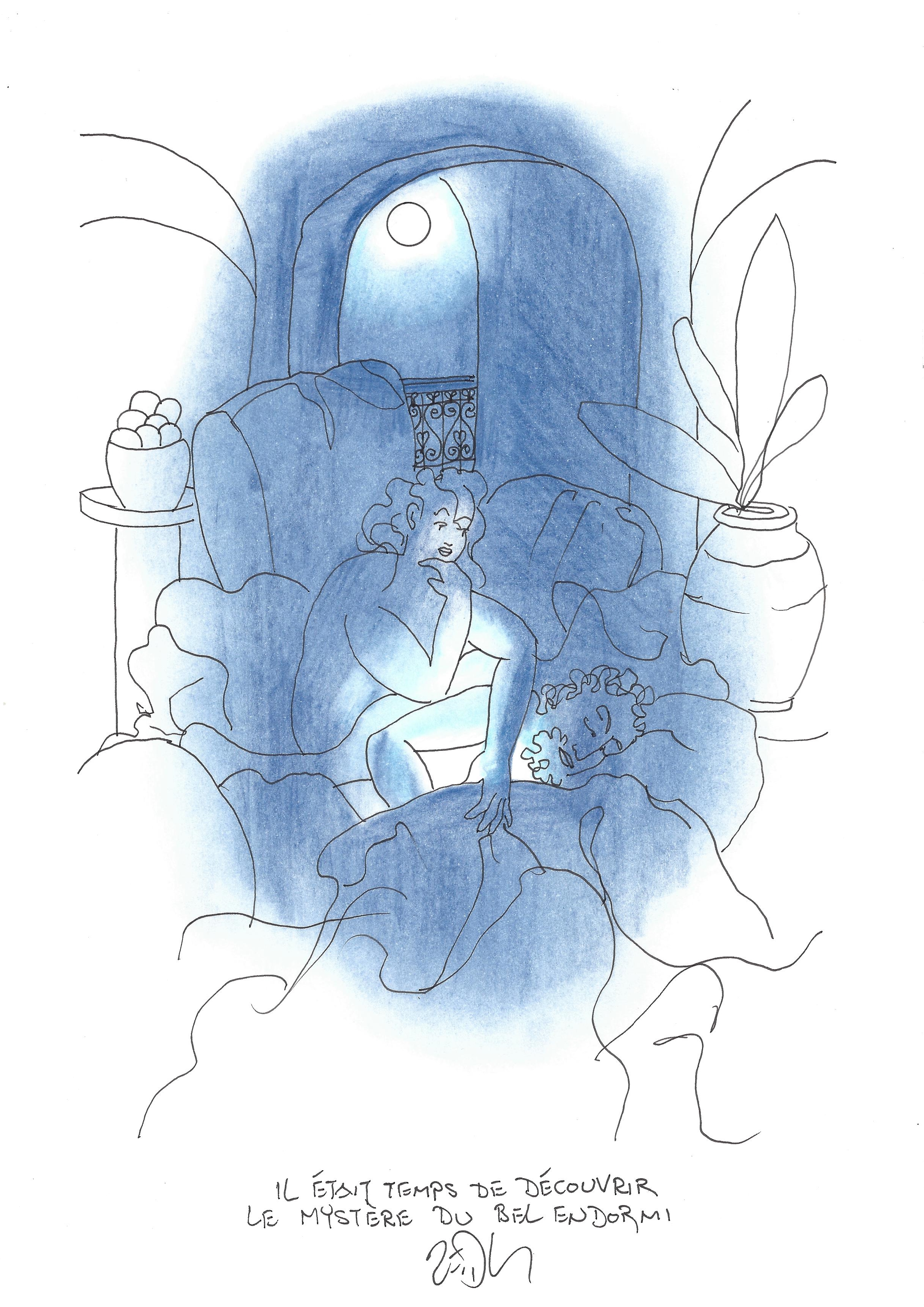 Drawing of the Day – 2641 – Dessin du jour « It was time to uncover the mystery of the sleeping beauty – Il était temps de découvrir le mystère du bel endormi » Ink & colour on Paper – 8 x 12″ (21 x 30 cm) – Encre & couleurs sur Papier