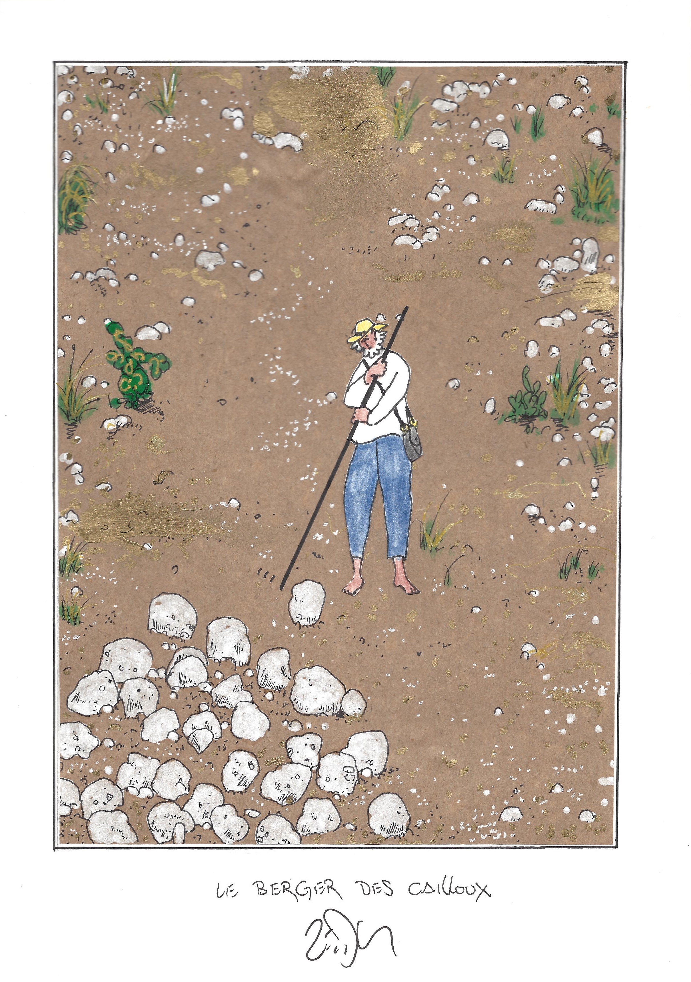 Drawing of the Day – 2642 – Dessin du jour « The rock shepherd – Le berger des cailloux » Mixed Media on Paper – 8 x 12″ (21 x 30 cm) – Technique mixte sur Papier