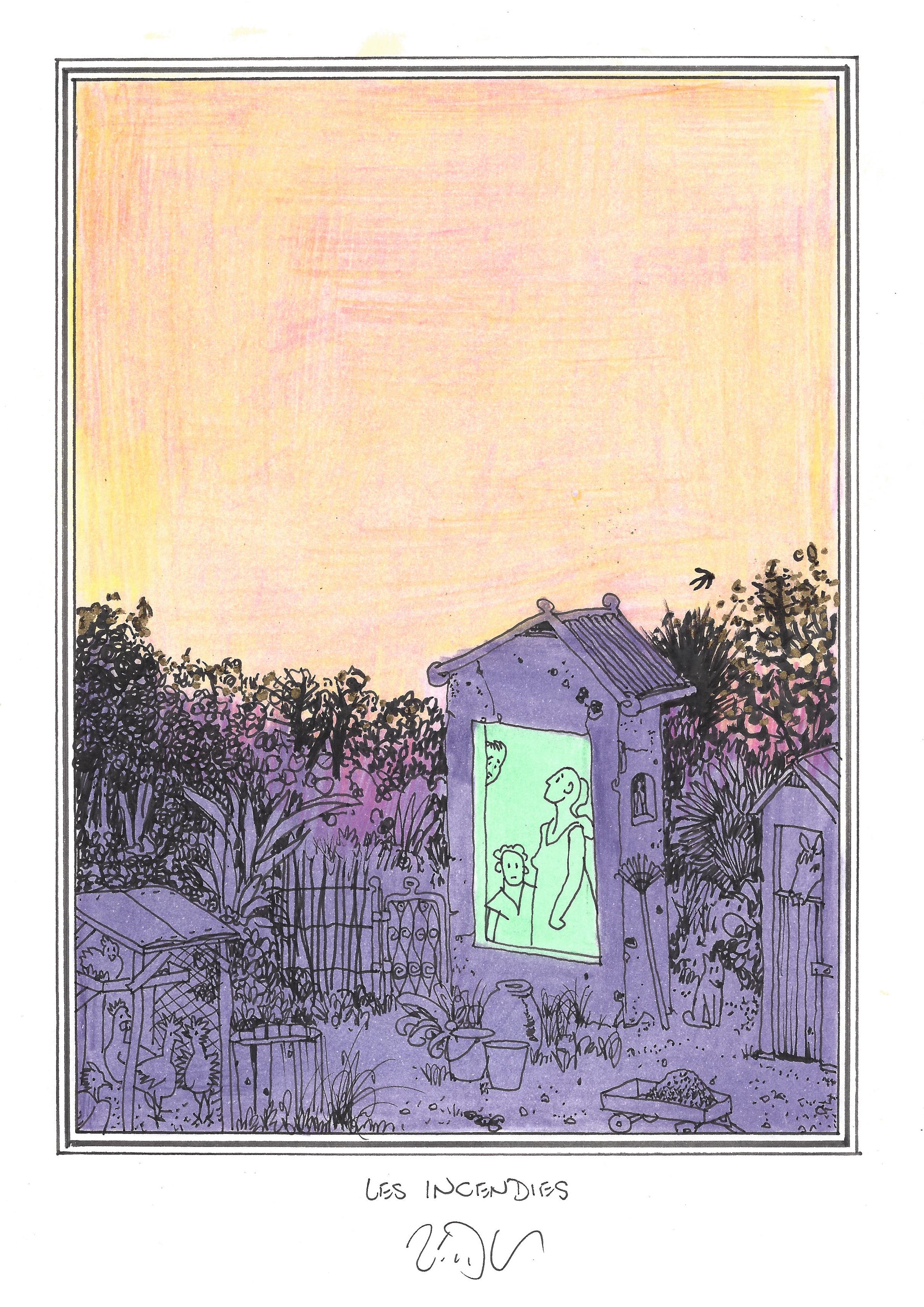 Drawing of the Day – 2643 – Dessin du jour « The fires – Les incendies » Ink & colour on Paper – 8 x 12″ (21 x 30 cm) – Encre & couleurs sur Papier