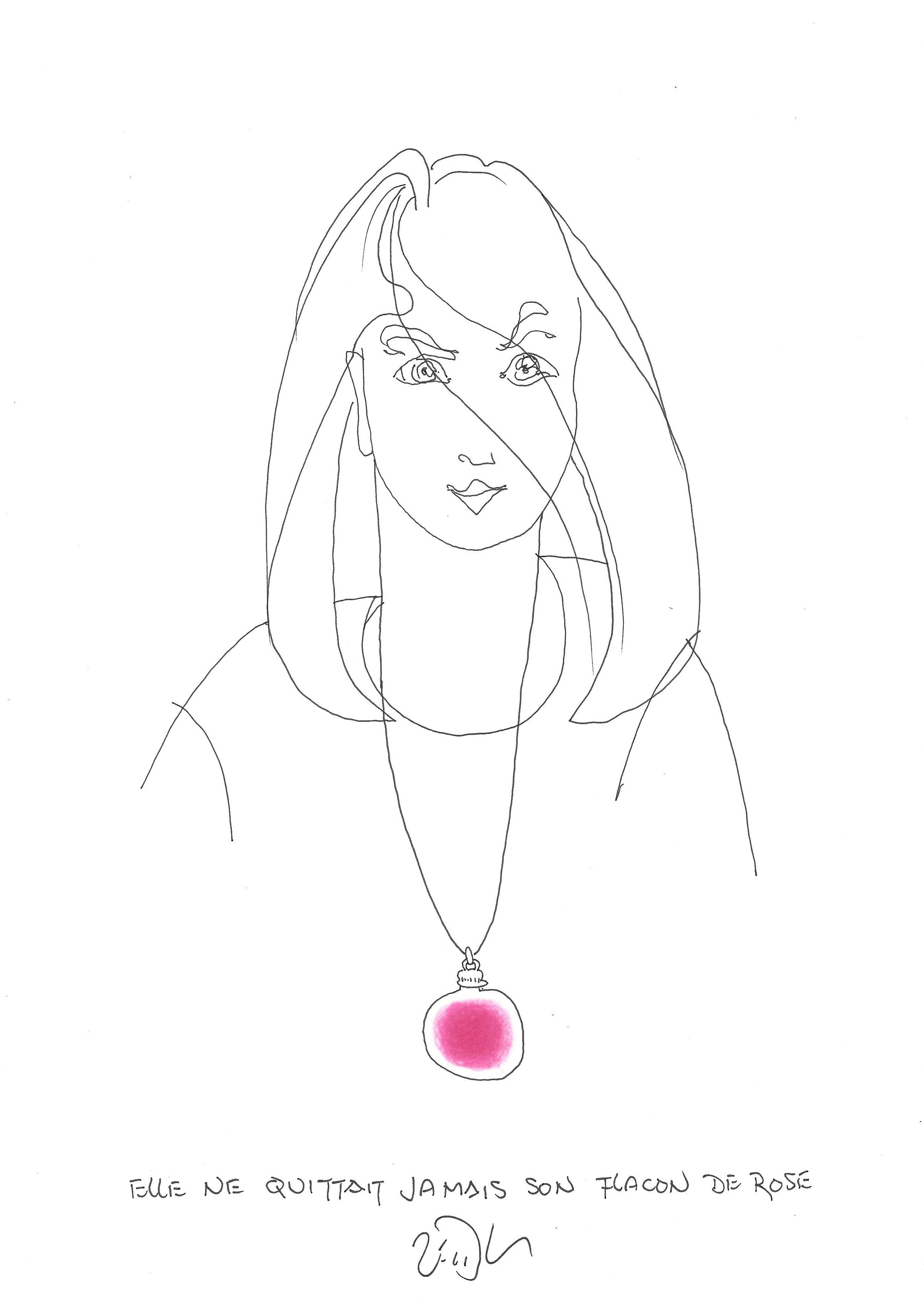 Drawing of the Day – 2645 – Dessin du jour « She was never without her vial of rose – Elle ne quittait jamais son flacon de rose » Ink & colour on Paper – 8 x 12″ (21 x 30 cm) – Encre & couleurs sur Papier