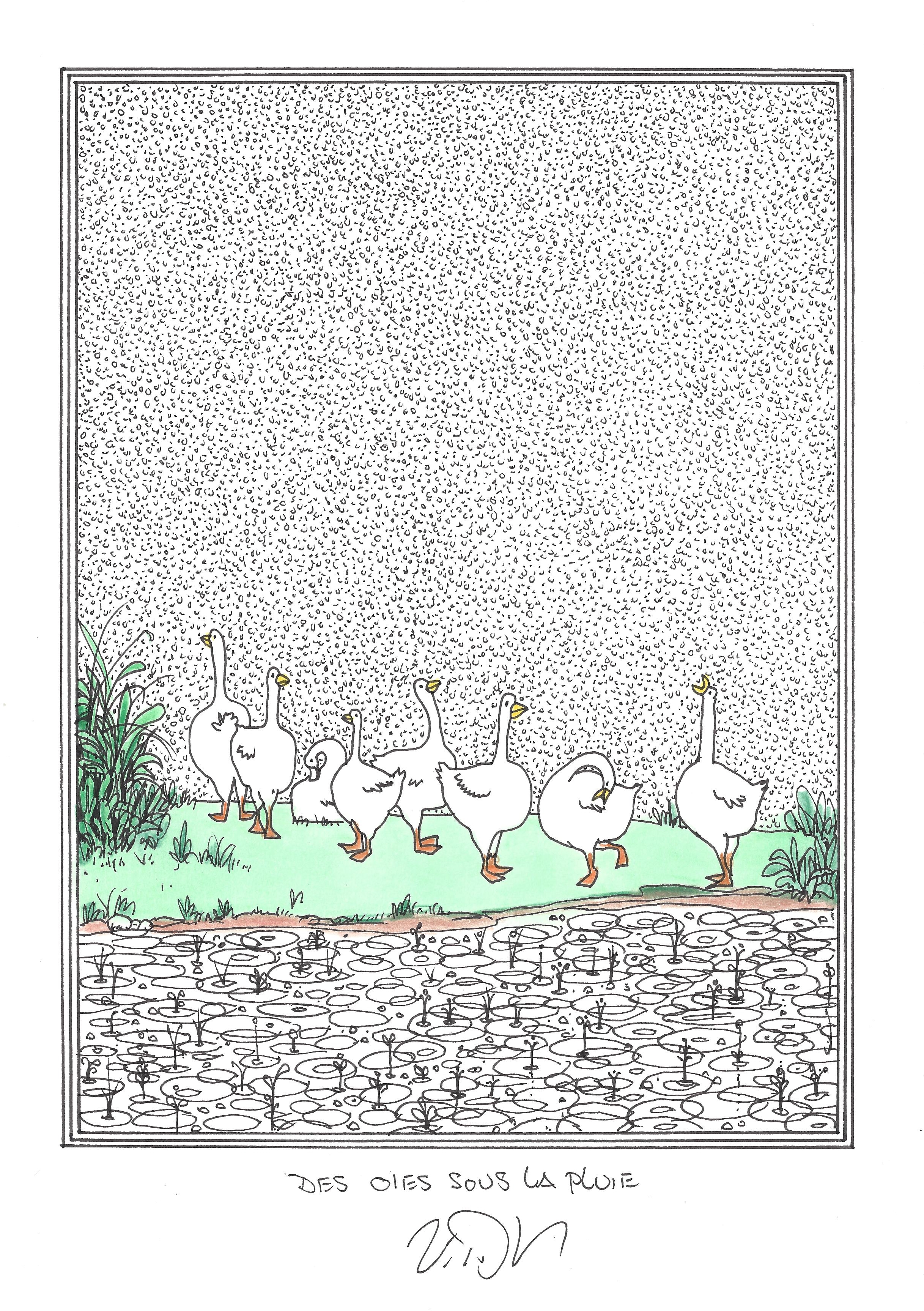 Drawing of the Day – 2646 – Dessin du jour « Geese in the rain – Des oies sous la pluie » Ink & colour on Paper – 8 x 12″ (21 x 30 cm) – Encre & couleurs sur Papier