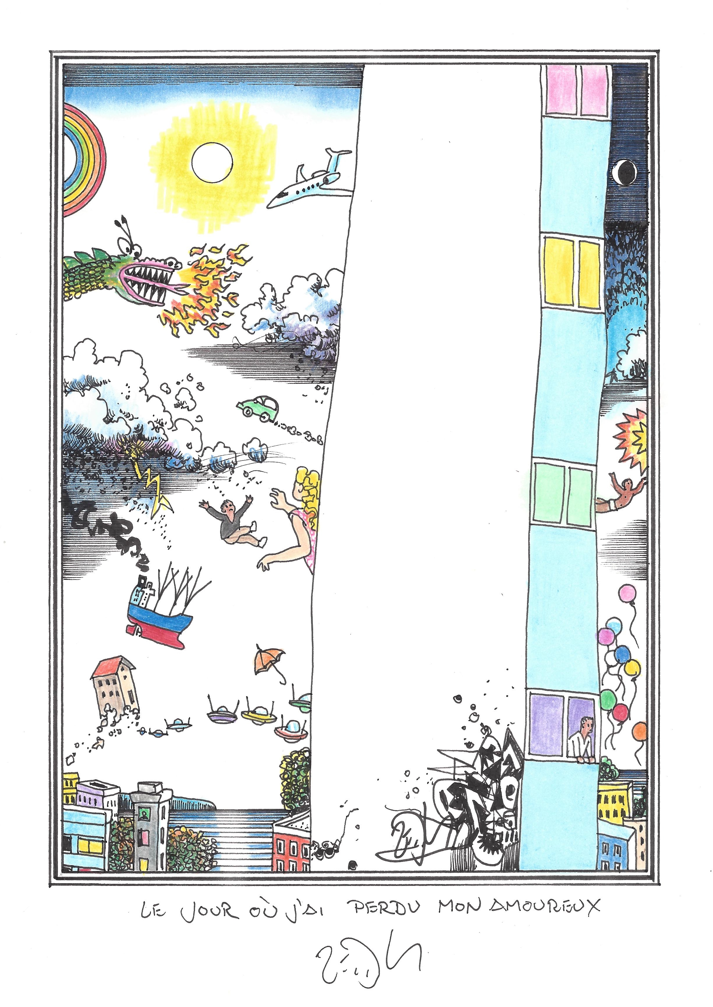 Drawing of the Day – 2647 – Dessin du jour « The day I lost my boyfriend – Le jour où j’ai perdu mon amoureux » Ink & colour on Paper – 8 x 12″ (21 x 30 cm) – Encre & couleurs sur Papier