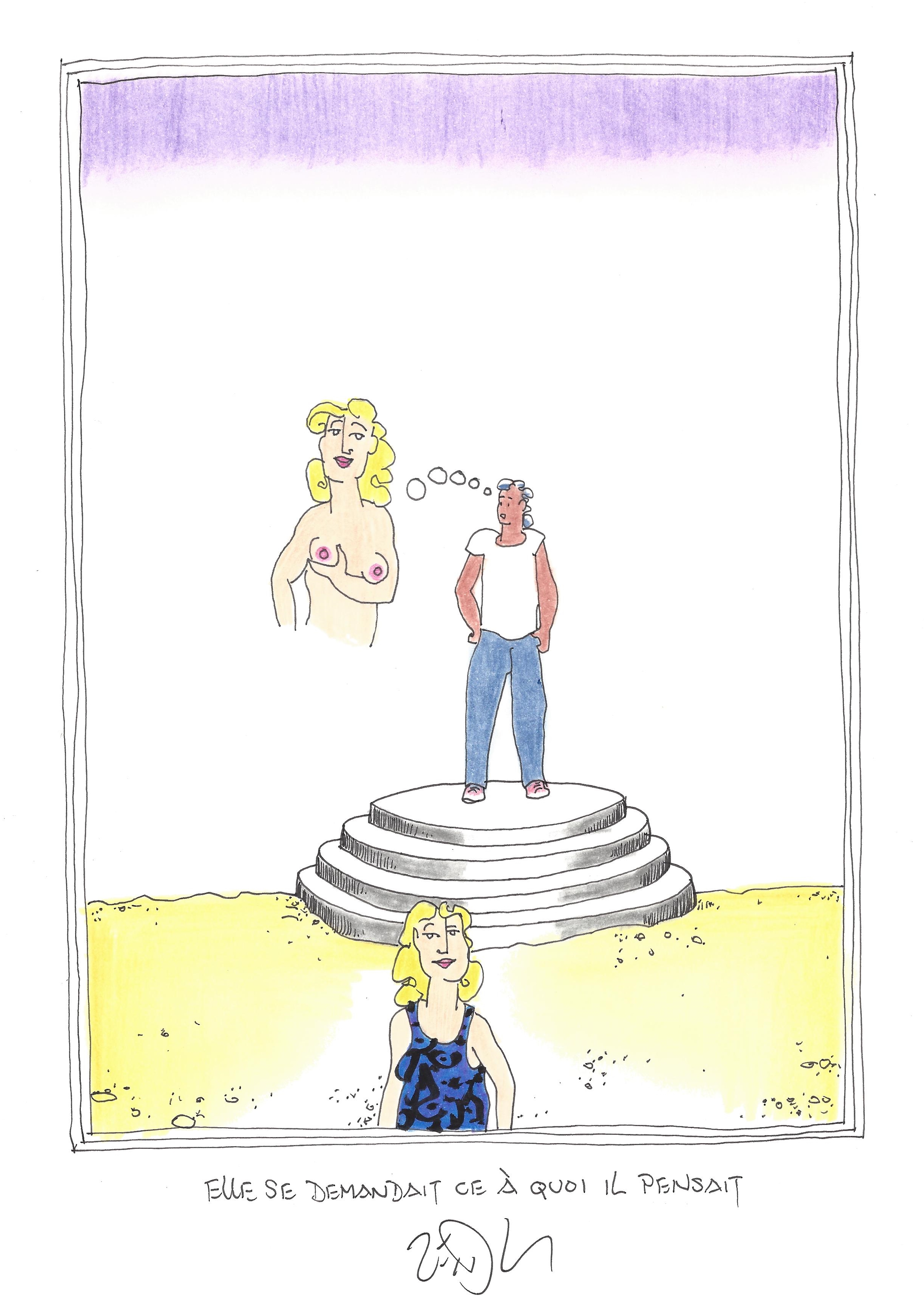 Drawing of the Day – 2629 – Dessin du jour « She wondered what he was thinking – Elle se demandait ce à quoi il pensait » Ink & color on Paper – 8 x 12″ (21 x 30 cm) – Encre & couleurs sur Papier