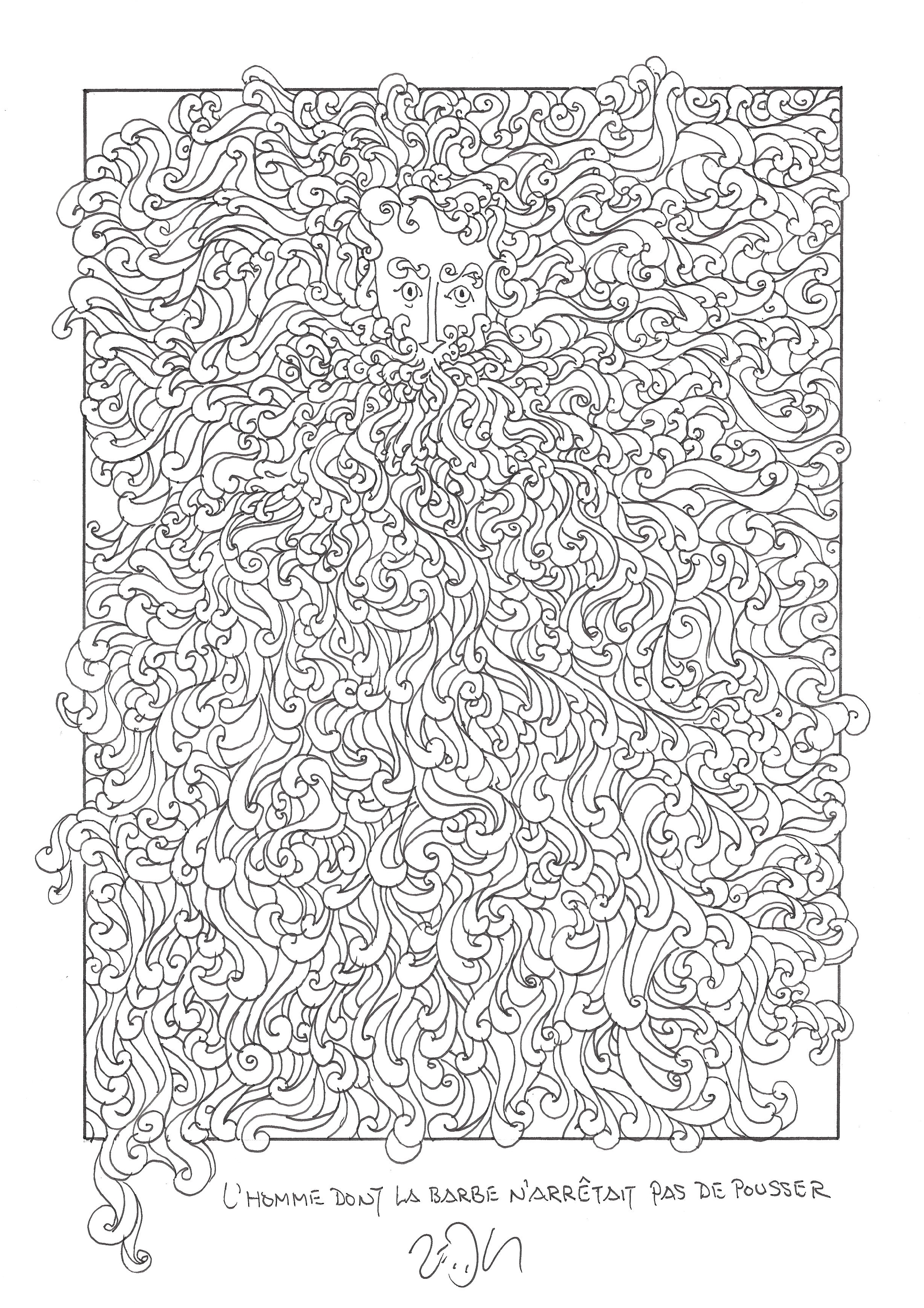 Drawing of the Day – 2630 – Dessin du jour « The man whose beard wouldn’t stop growing – L’homme dont la barbe n’arrêtait pas de pousser » Ink on Paper – 8 x 12″ (21 x 30 cm) – Encre sur Papier