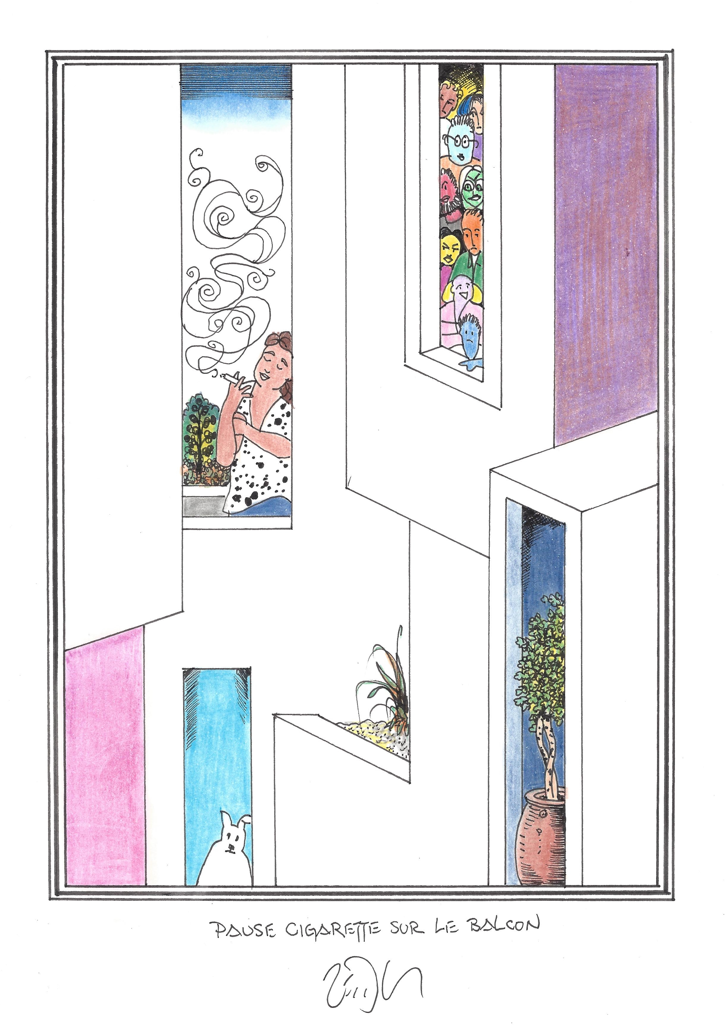 Drawing of the Day – 2631 – Dessin du jour « Smoke break out on the balcony – Pause cigarette sur le balcon » Ink & color on Paper – 8 x 12″ (21 x 30 cm) – Encre & couleurs sur Papier