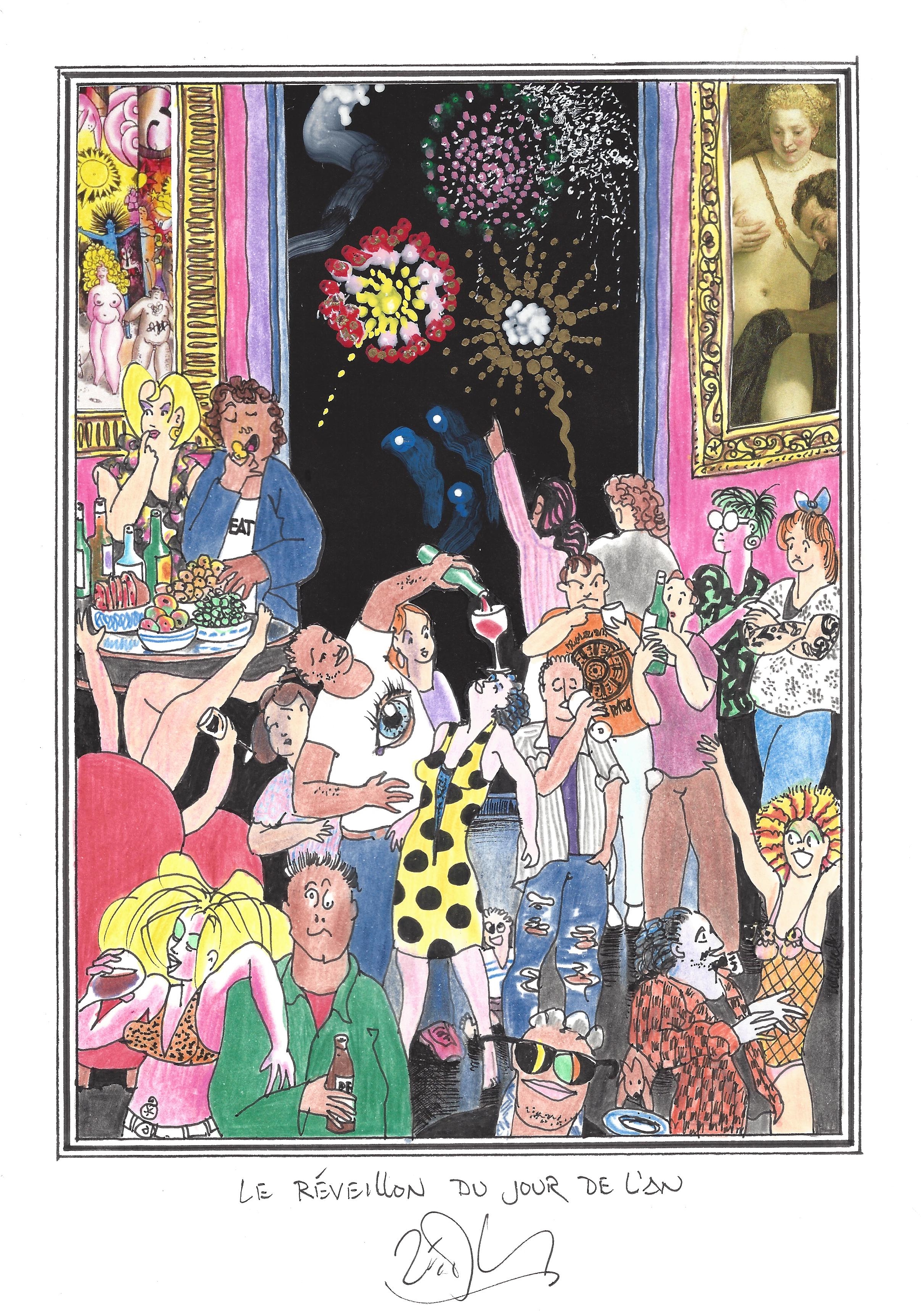 Drawing of the Day – 2632 – Dessin du jour « New Year’s Eve – Le réveillon du jour de l’an » Mixed Media on Paper – 8 x 12″ (21 x 30 cm) – Technique mixte sur Papier