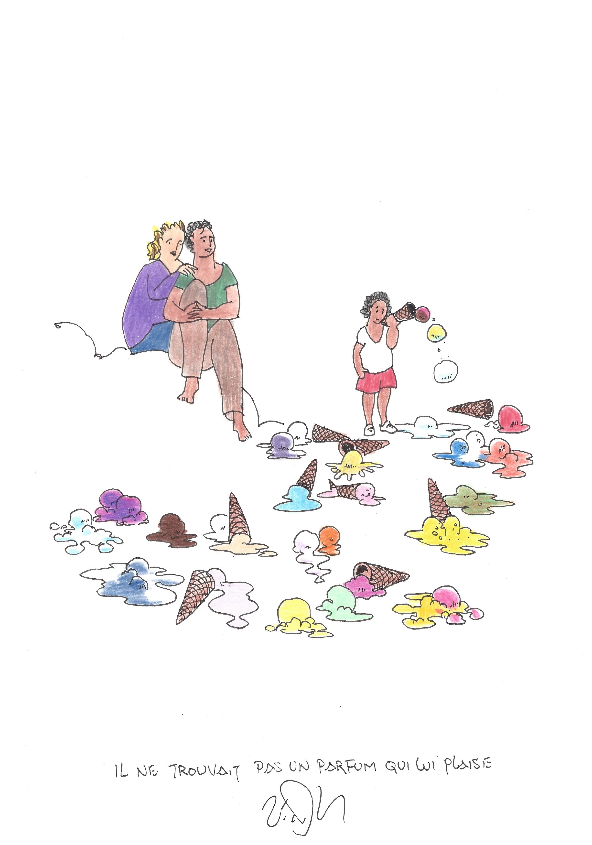 Drawing of the Day – 2633 – Dessin du jour « He just couldn’t find a flavour he liked – Il ne trouvait pas un parfum qui lui plaise » Ink & color on Paper – 8 x 12″ (21 x 30 cm) – Encre & couleurs sur Papier