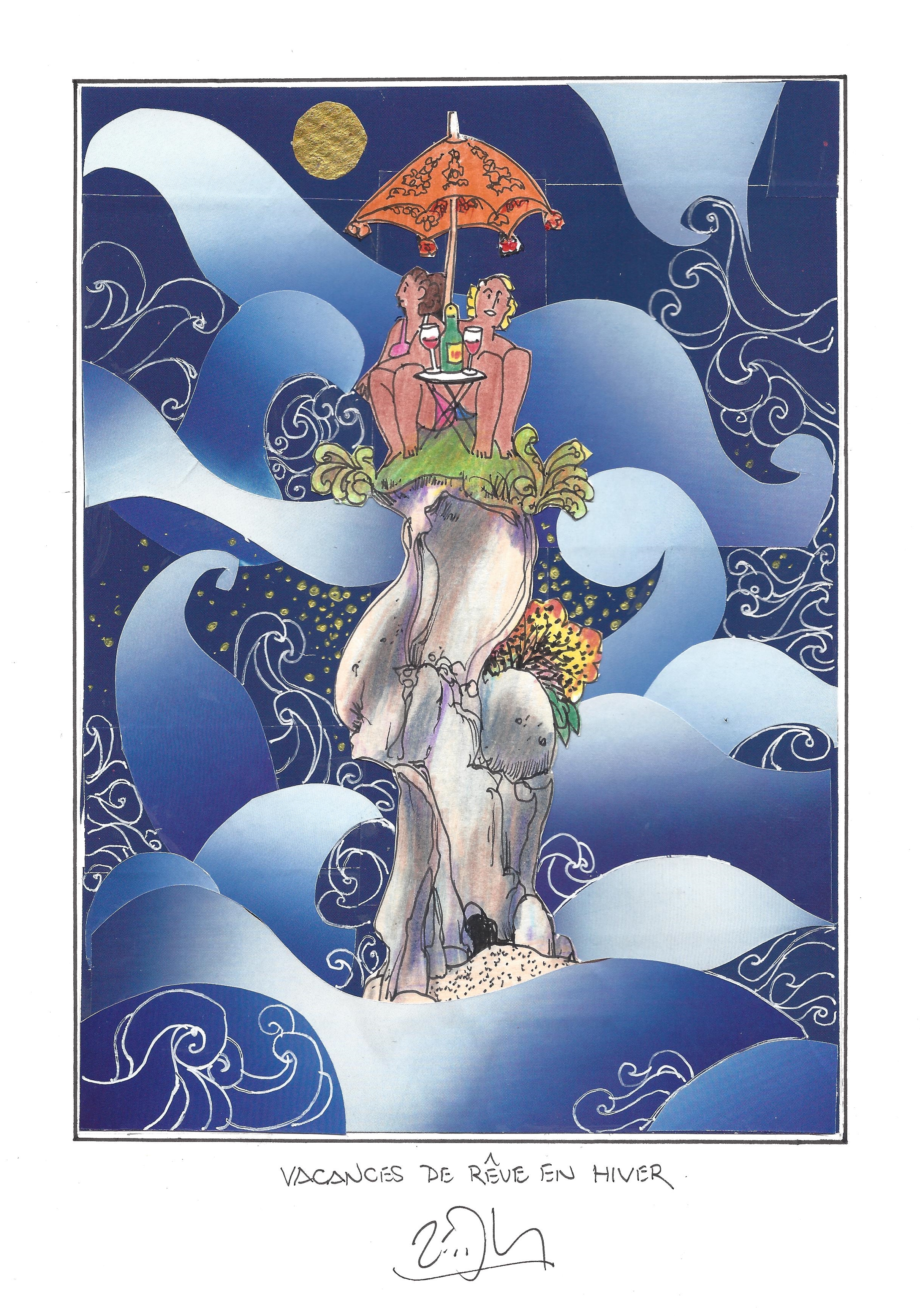 Drawing of the Day – 2634 – Dessin du jour « Dream winter vacation – Vacances de rêve en hiver » Mixed Media on Paper – 8 x 12″ (21 x 30 cm) – Technique mixte sur Papier