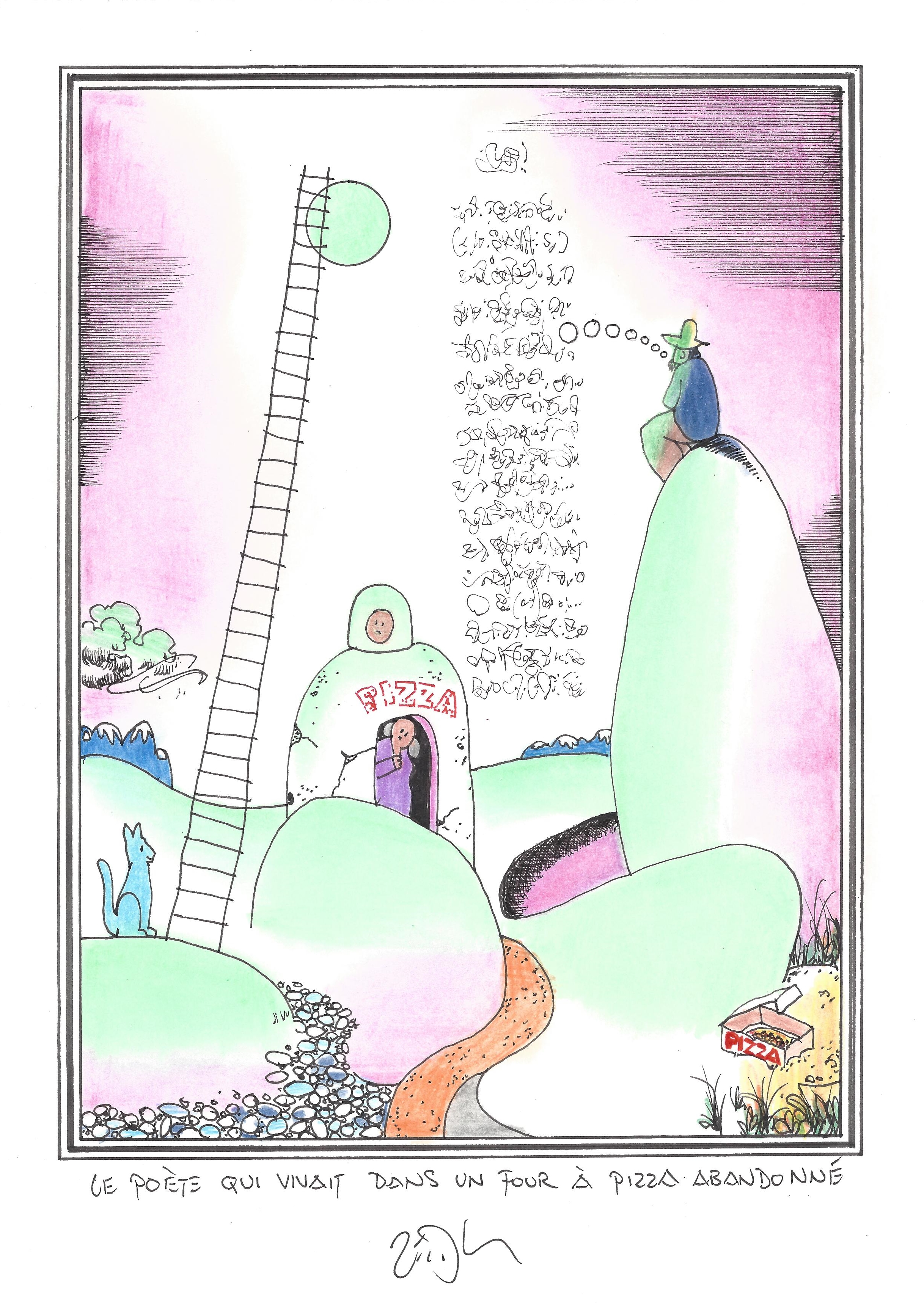 Drawing of the Day – 2636 – Dessin du jour « The poet who lived in an abandoned pizza oven – Le poète qui vivait dans un four à pizza abandonné » Ink & color on Paper – 8 x 12″ (21 x 30 cm) – Encre & couleurs sur Papier