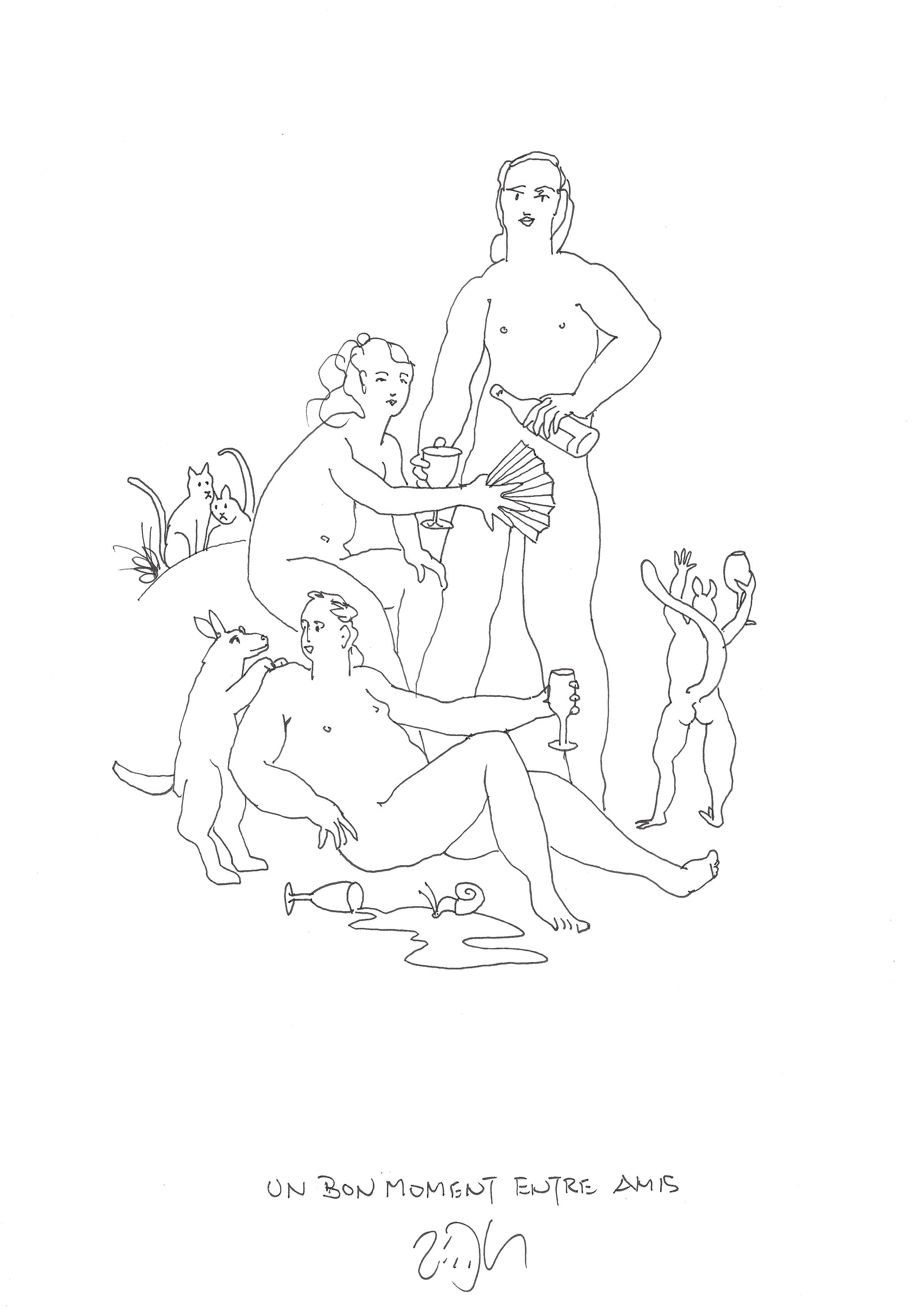 Drawing of the Day – 2619 – Dessin du jour « Having a good time with friends – Un bon moment entre amis » Ink on Paper – 8 x 12″ (21 x 30 cm) – Encre sur Papier