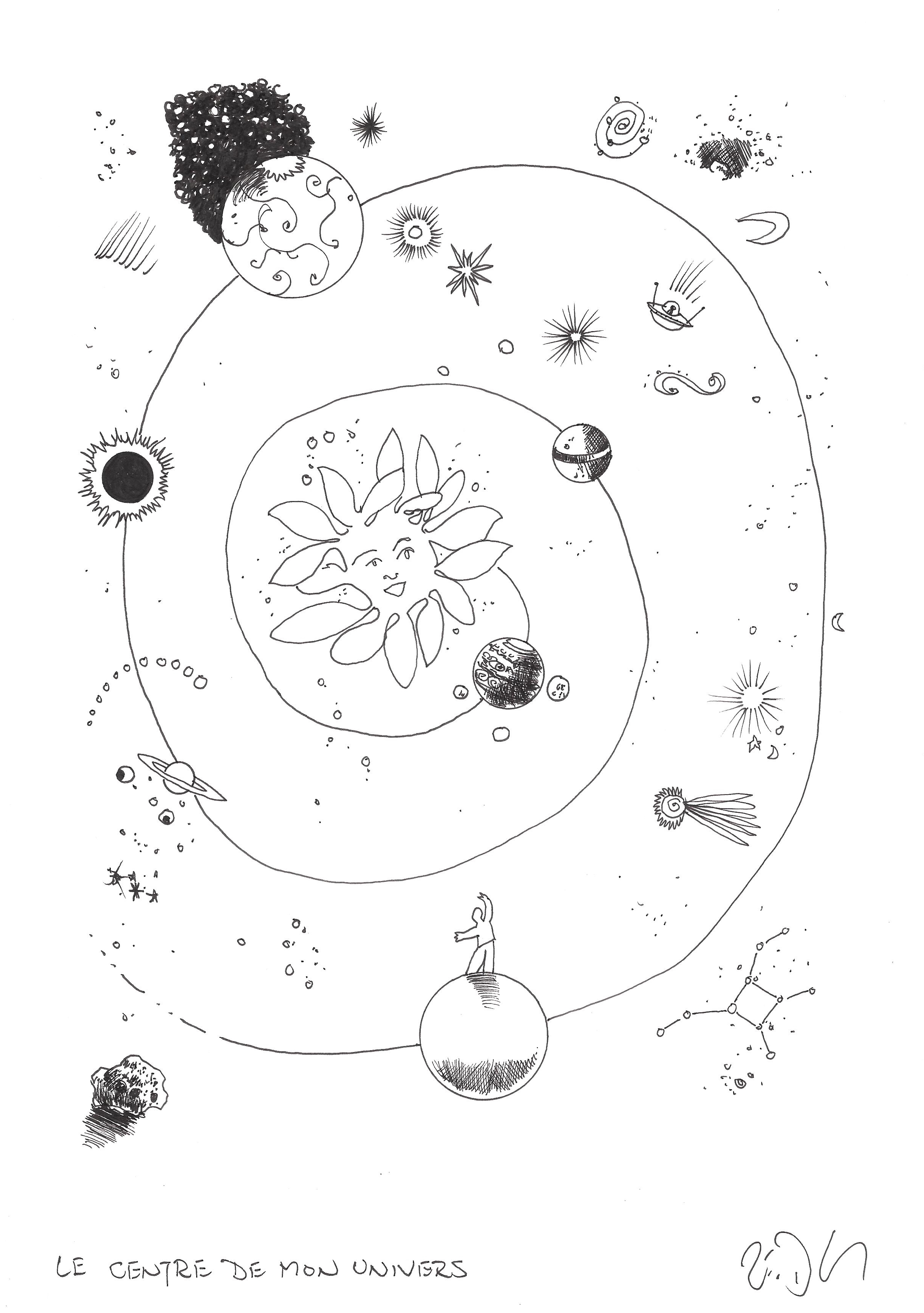 Drawing of the Day – 2620 – Dessin du jour « The center of my universe – Le centre de mon univers » Ink on Paper – 8 x 12″ (21 x 30 cm) – Encre sur Papier