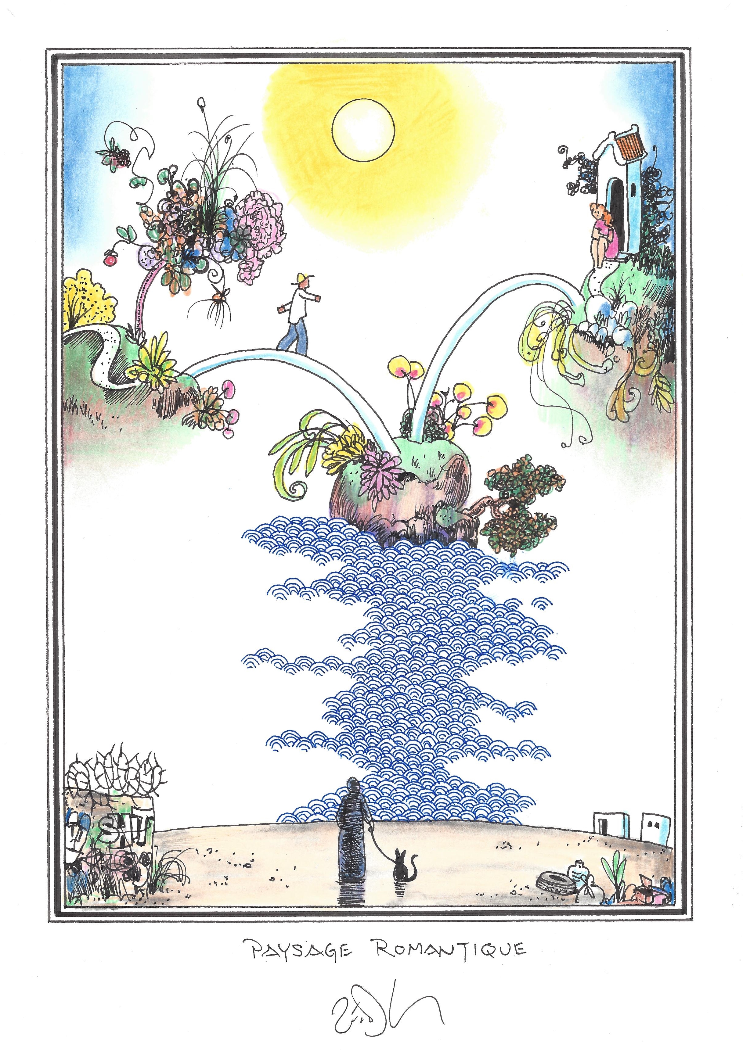 Drawing of the Day – 2622 – Dessin du jour « Romantic landscape – Paysage romantique » Ink & color on Paper – 8 x 12″ (21 x 30 cm) – Encre & couleurs sur Papier