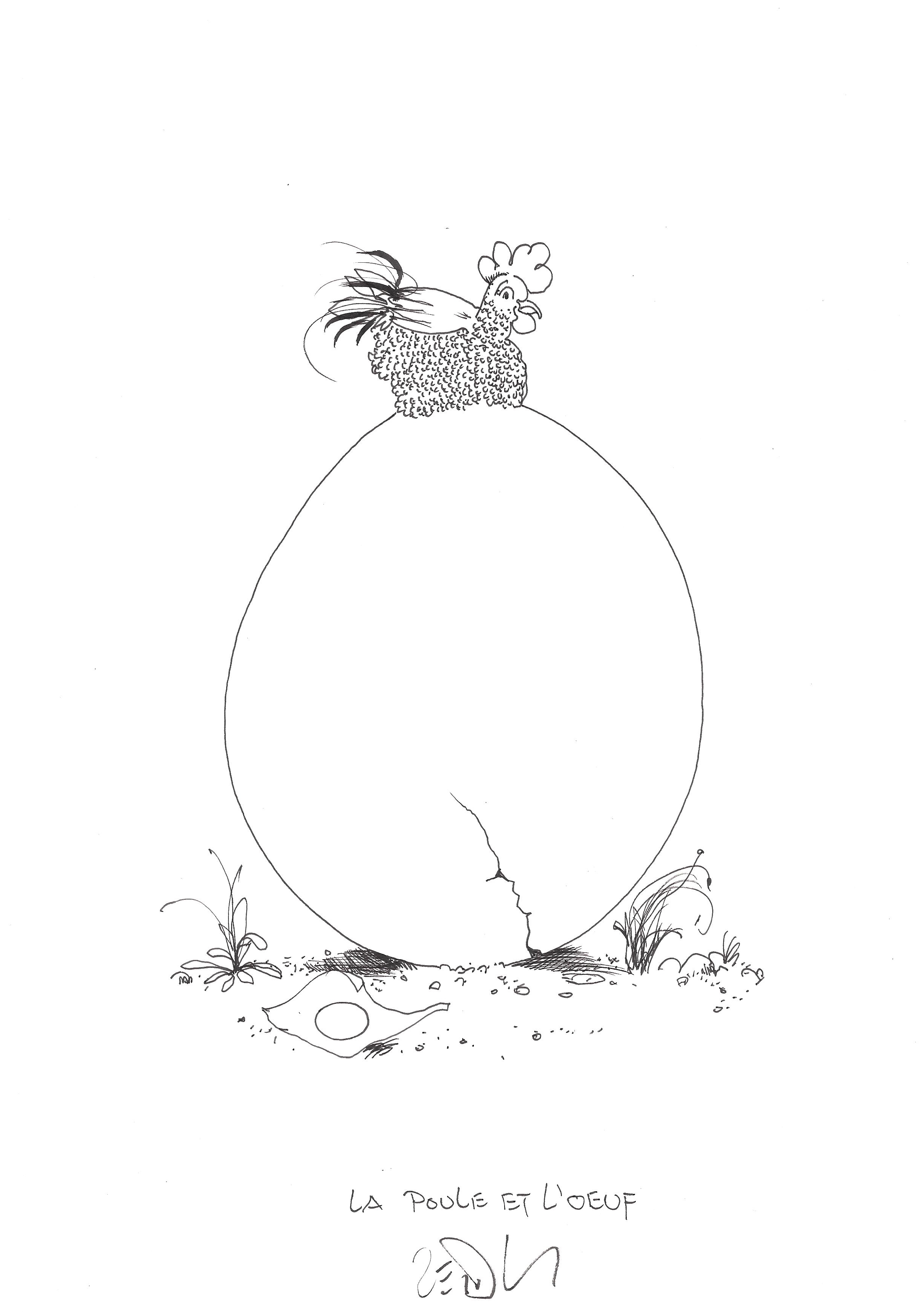 Drawing of the Day – 2623 – Dessin du jour « The chicken and the egg – La poule et l’œuf » Ink on Paper – 8 x 12″ (21 x 30 cm) – Encre sur Papier