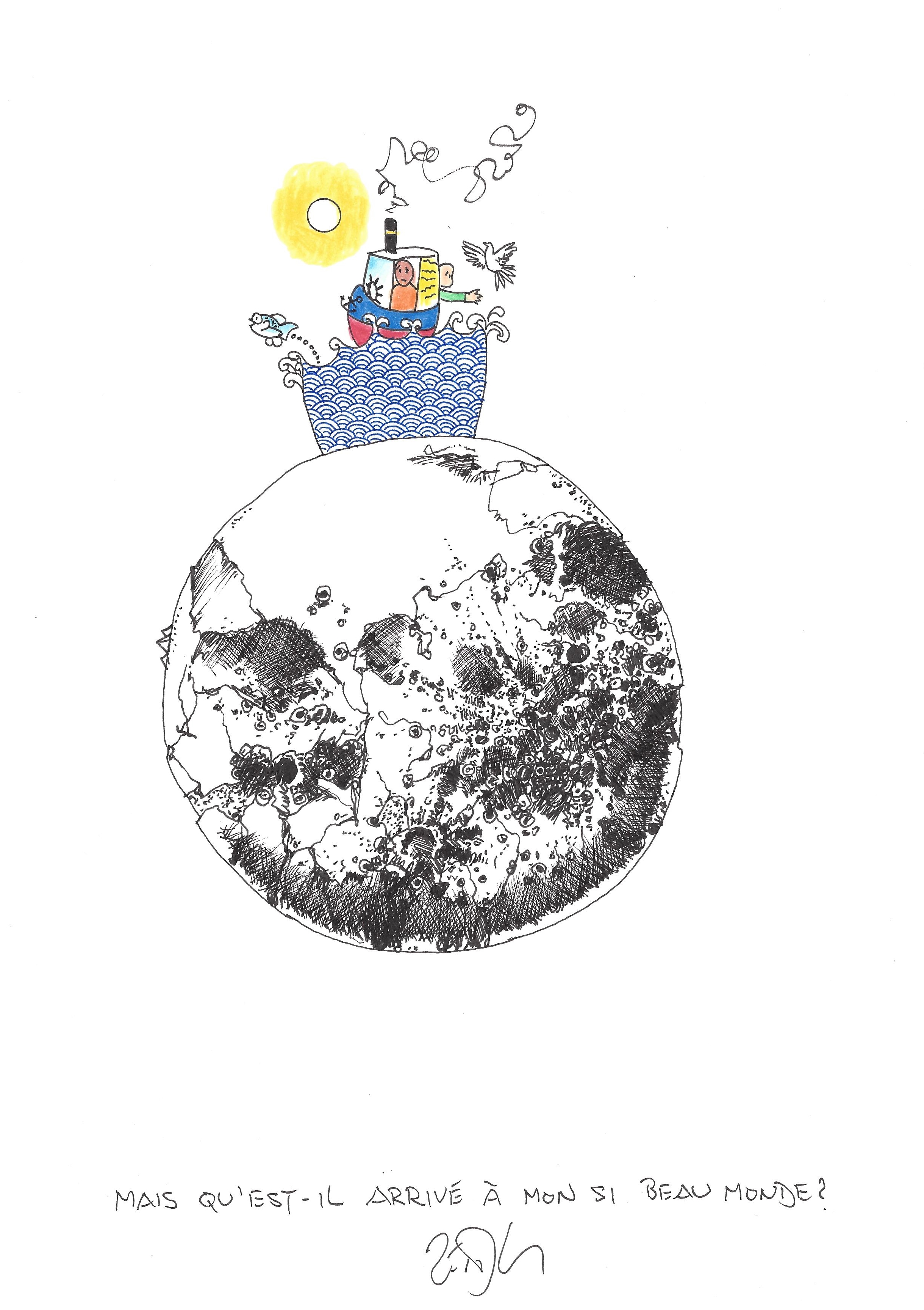 Drawing of the Day – 2625 – Dessin du jour « Whatever happened to my beautiful world ? – Mais qu’est-il arrivé à mon si beau monde ? » Ink & color on Paper – 8 x 12″ (21 x 30 cm) – Encre & couleurs sur Papier