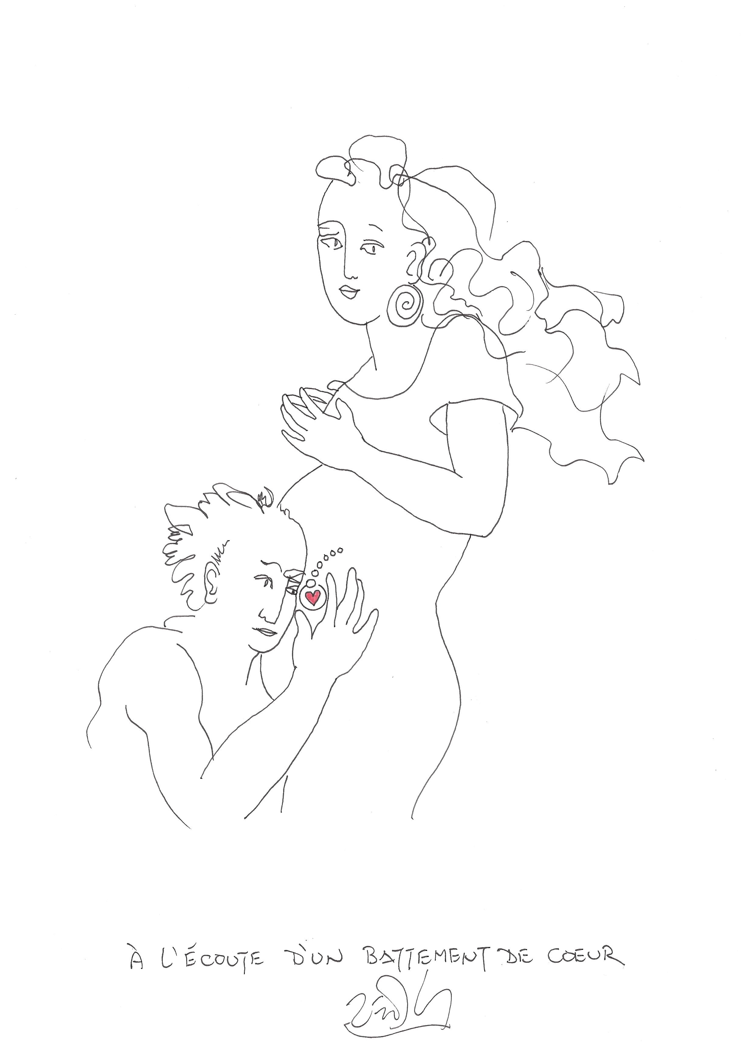 Drawing of the Day – 2626 – Dessin du jour « Listening for a heartbeat – À l’écoute d’un battement de cœur » Ink & color on Paper – 8 x 12″ (21 x 30 cm) – Encre & couleurs sur Papier