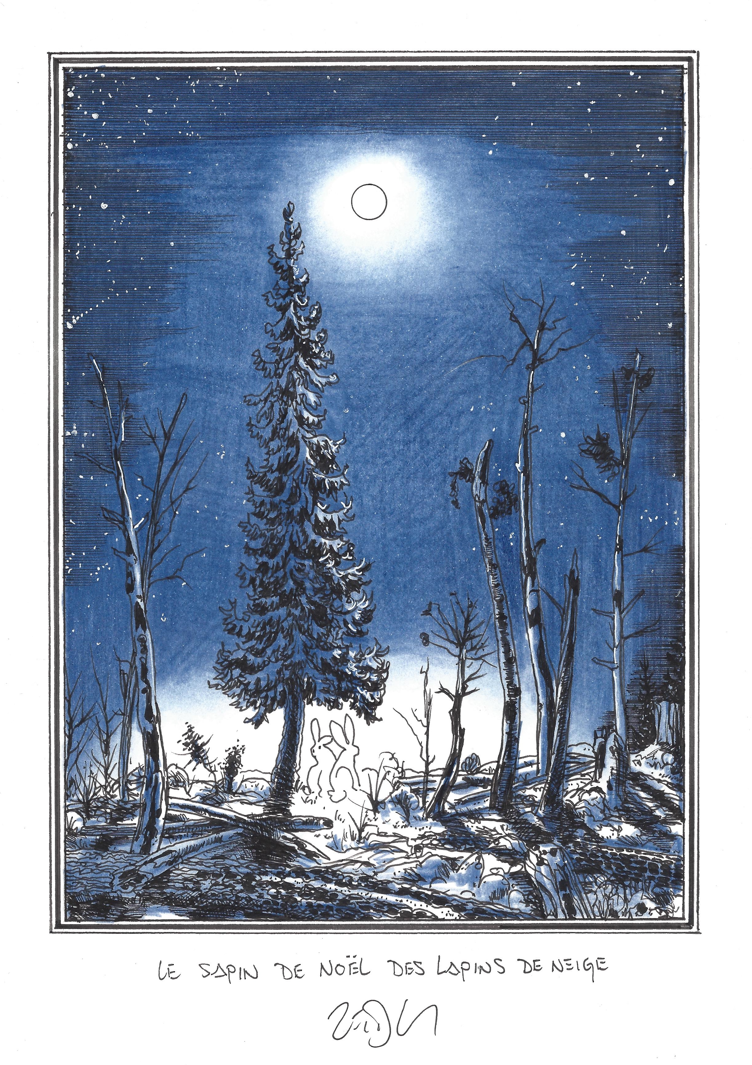Drawing of the Day – 2628 – Dessin du jour « The snow rabbits Christmas tree – Le sapin de Noël des lapins de neige » Ink & color on Paper – 8 x 12″ (21 x 30 cm) – Encre & couleurs sur Papier