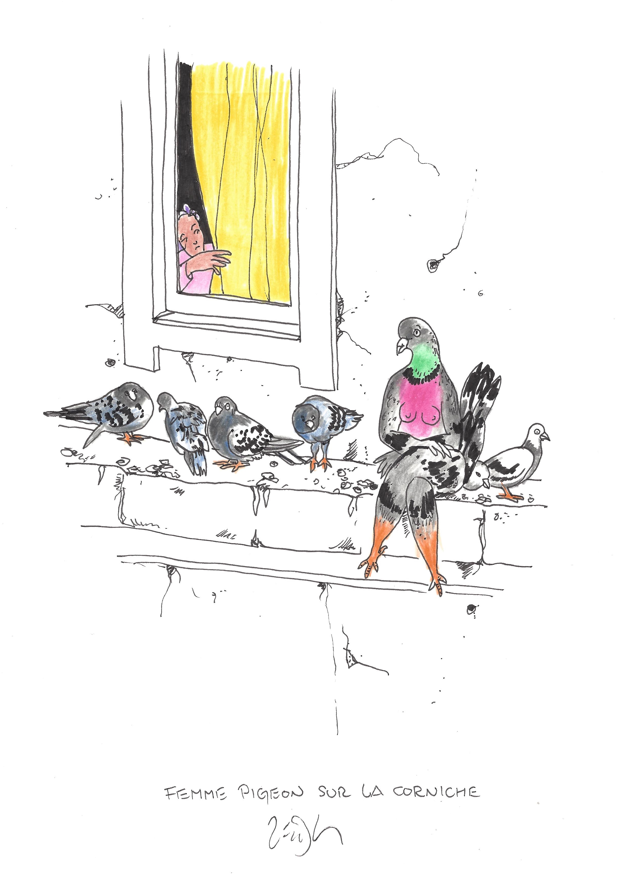 Drawing of the Day – 2491 – Dessin du jour « Pigeon lady on the ledge – Femme pigeon sur la corniche » Ink & color on Paper – 8 x 12″ (21 x 30 cm) – Encre & couleurs sur Papier