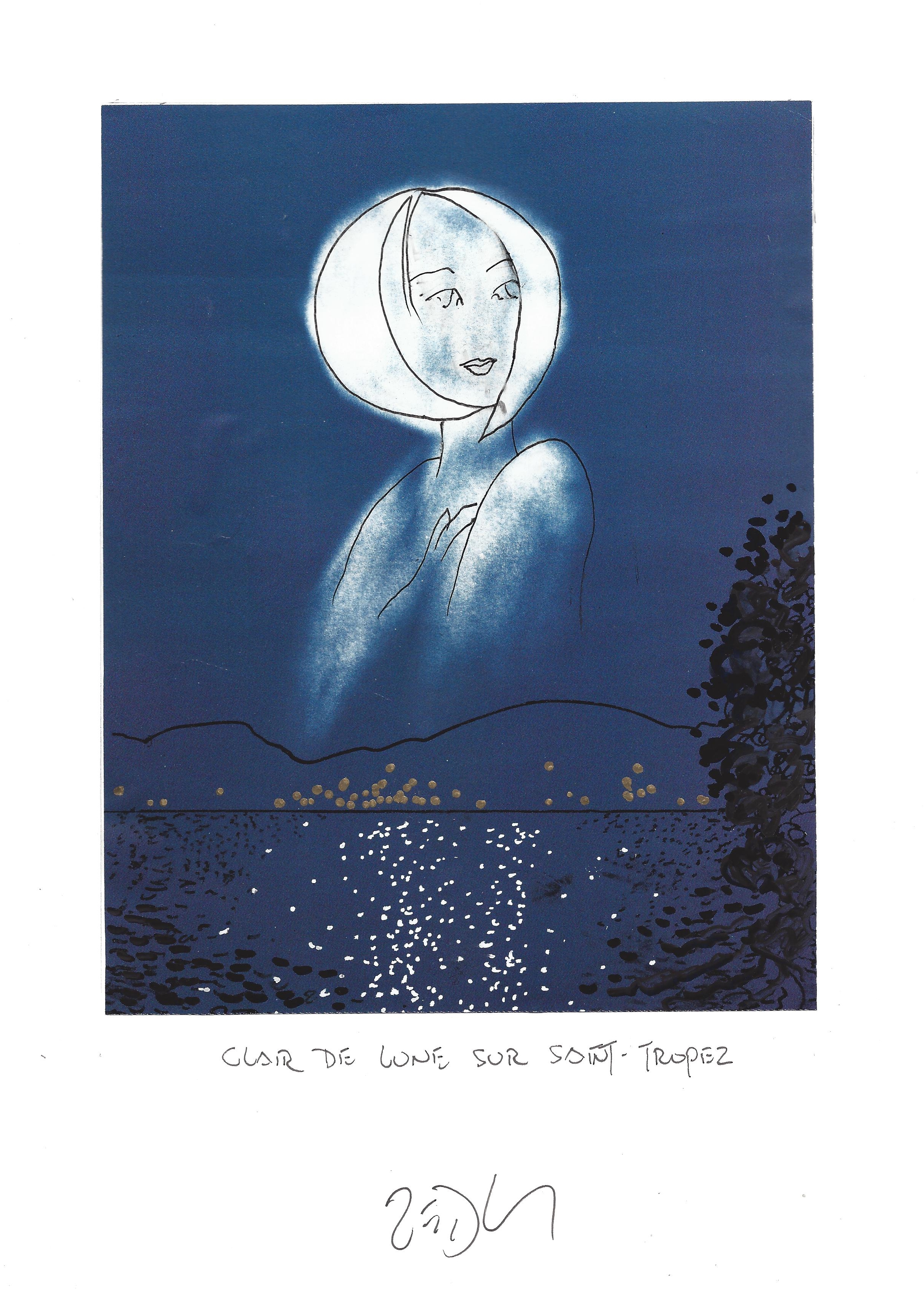 Drawing of the Day – 2492 – Dessin du jour « Moonlight over Saint-Tropez – Clair de lune sur Saint-Tropez » Mixed Media on Paper – 8 x 12″ (21 x 30 cm) – Technique mixte sur Papier