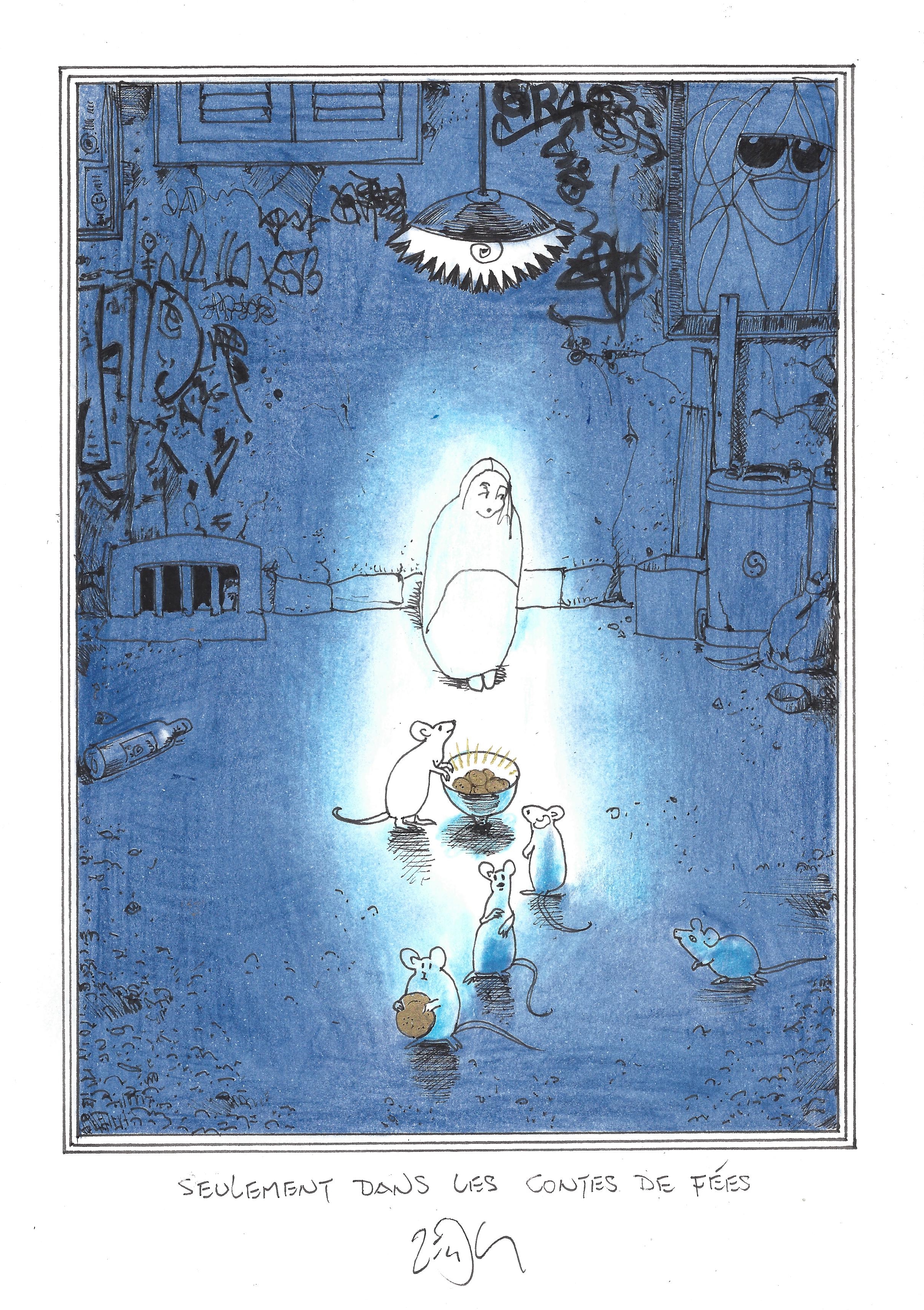 Drawing of the Day – 2494 – Dessin du jour « Only in fairy tales – Seulement dans les contes de fées » Ink & color on Paper – 8 x 12″ (21 x 30 cm) – Encre & couleurs sur Papier