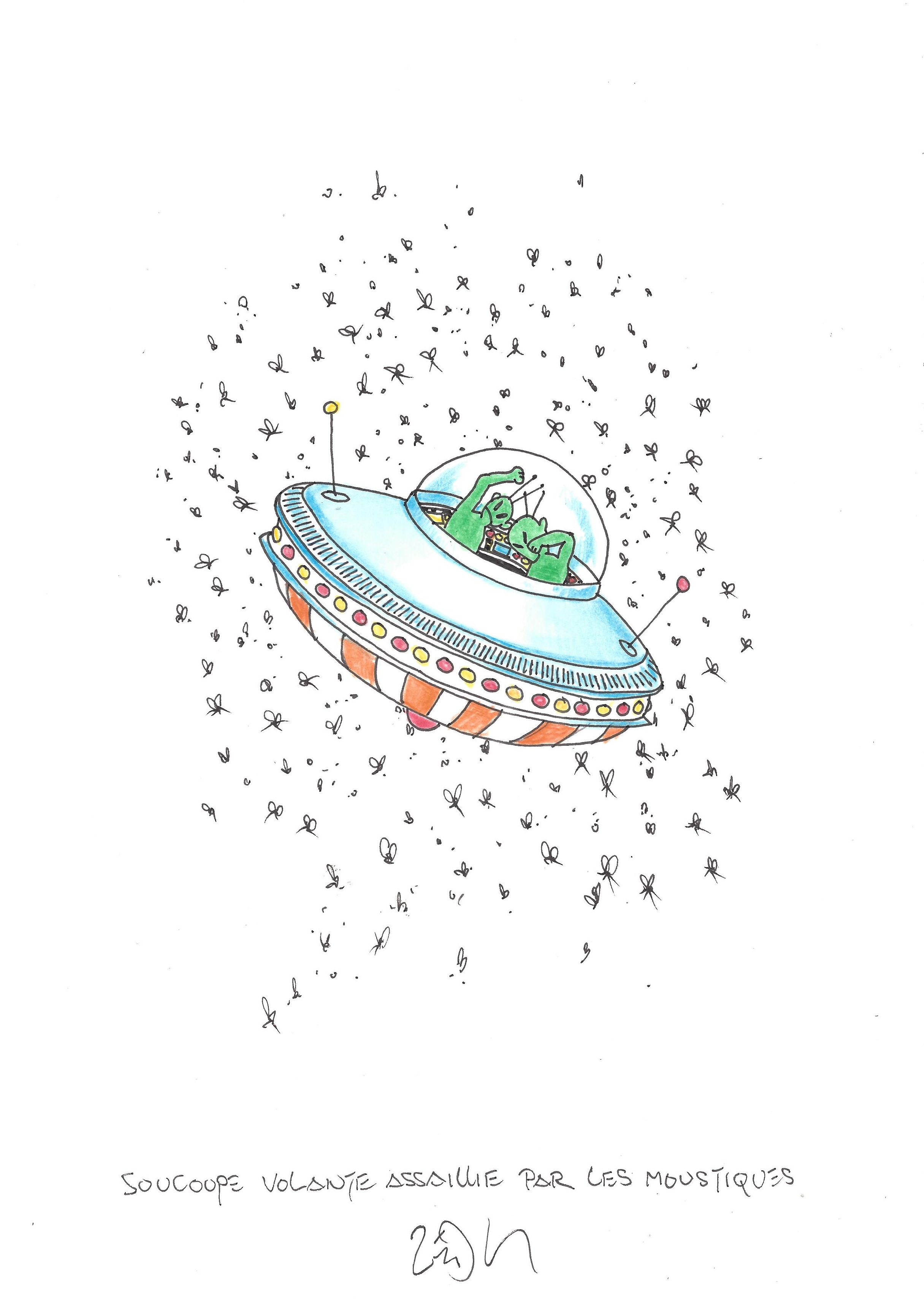 Drawing of the Day – 2495 – Dessin du jour « Flying saucer plagued by mosquitos – Soucoupe volante assaillie par les moustiques » Ink & color on Paper – 8 x 12″ (21 x 30 cm) – Encre & couleurs sur Papier