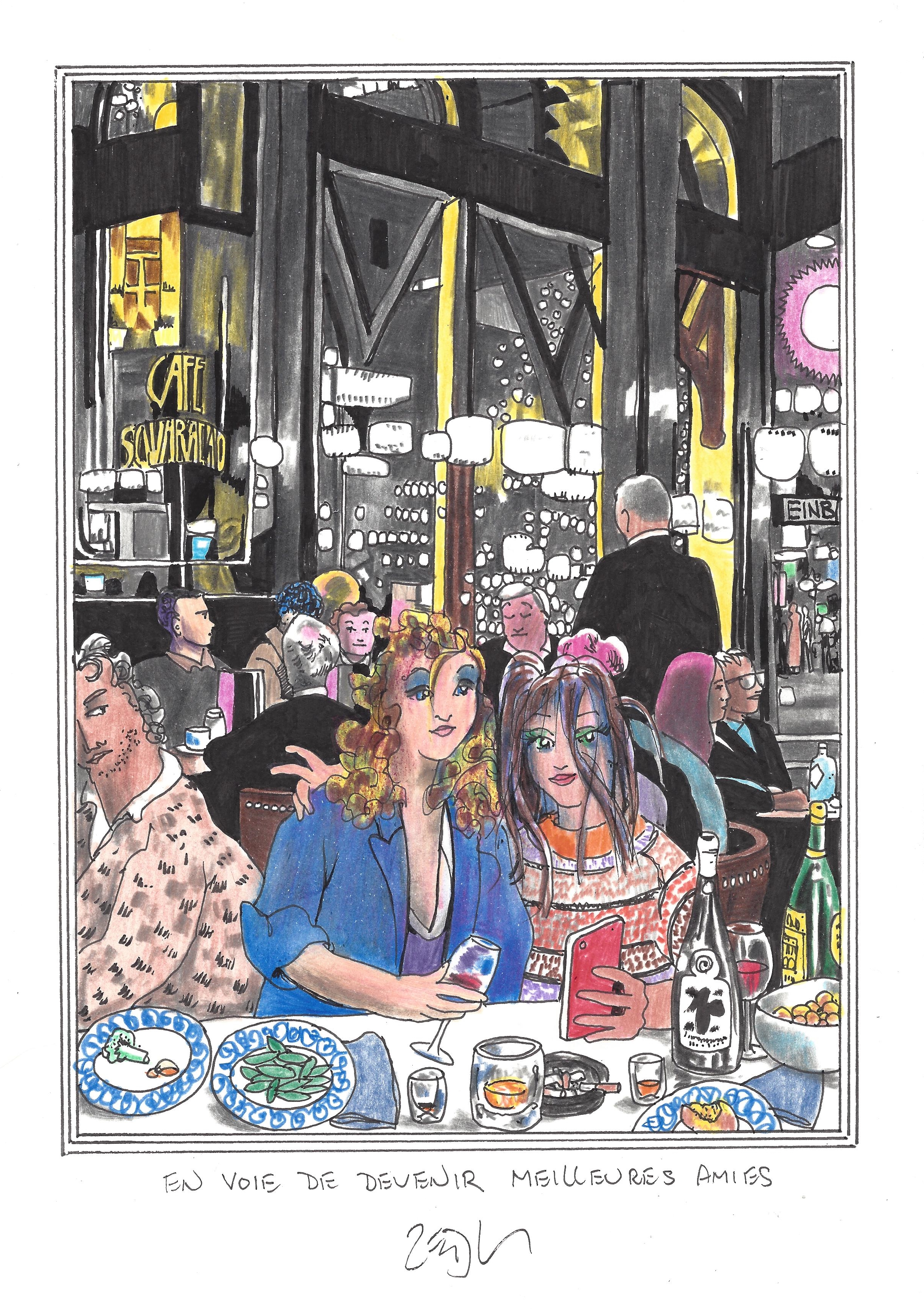 Drawing of the Day – 2496 – Dessin du jour « On their way to becoming best friends forever – En voie de devenir meilleures amies » Ink & color on Paper – 8 x 12″ (21 x 30 cm) – Encre & couleurs sur Papier