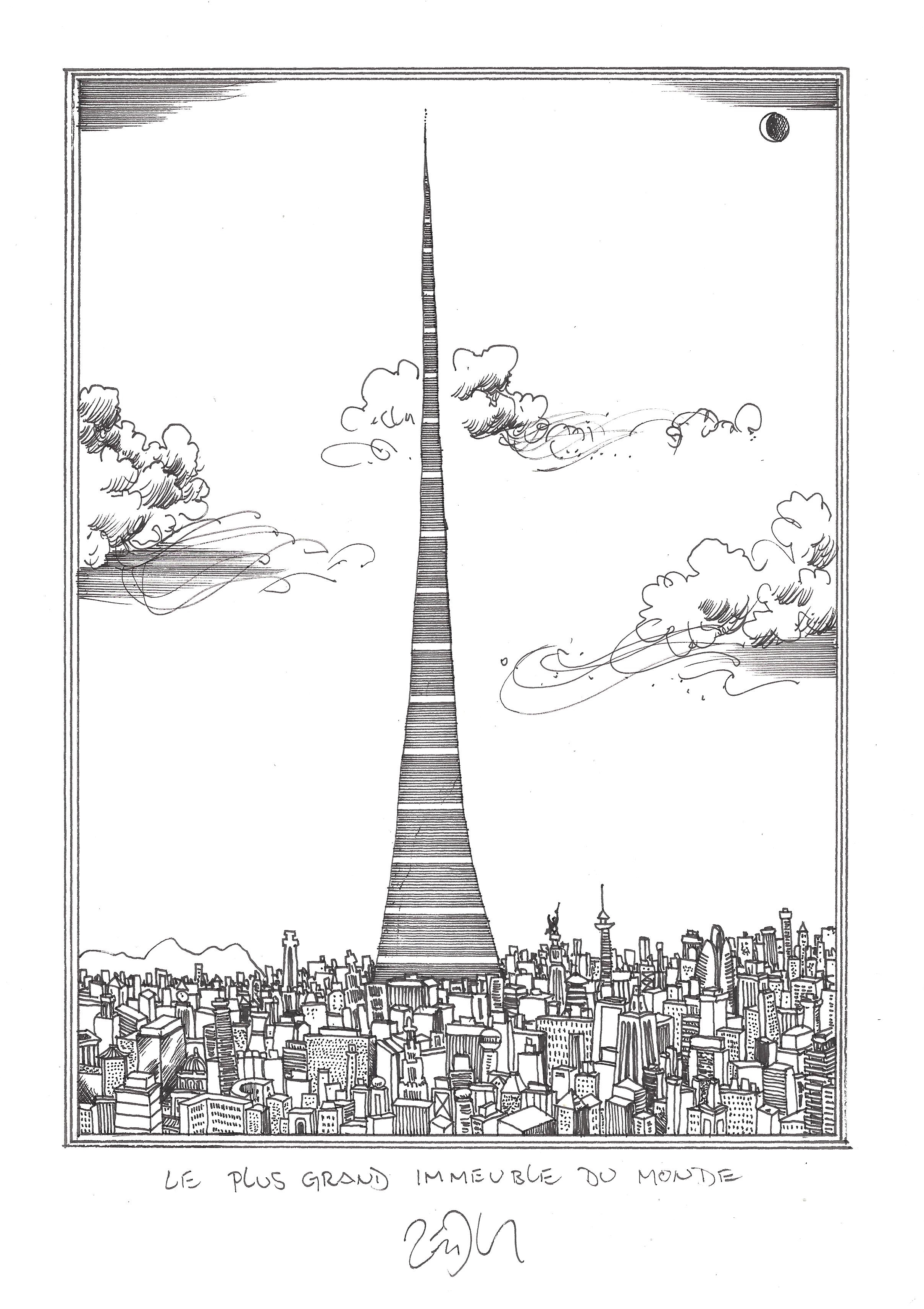 Drawing of the Day – 2497 – Dessin du jour « The tallest building in the world – Le plus grand immeuble du monde » Ink on Paper – 8 x 12″ (21 x 30 cm) – Encre sur Papier